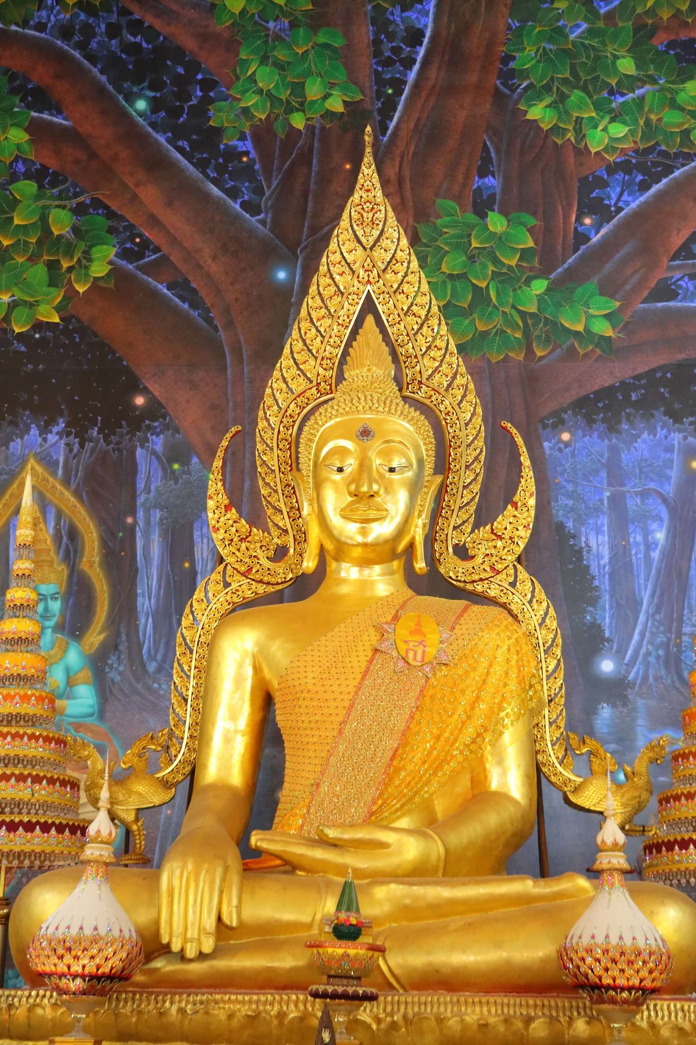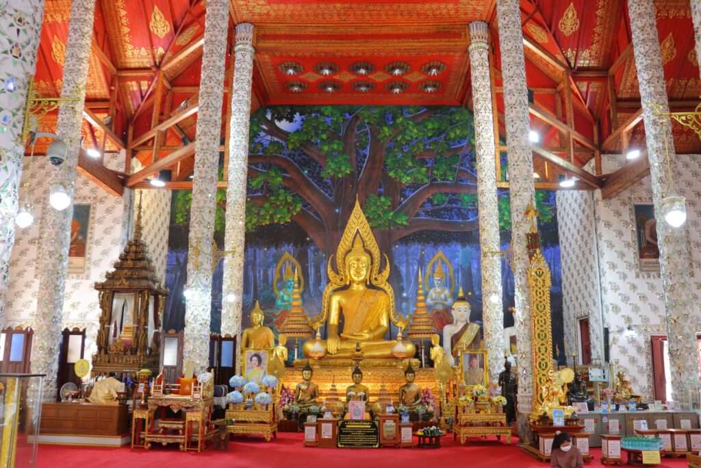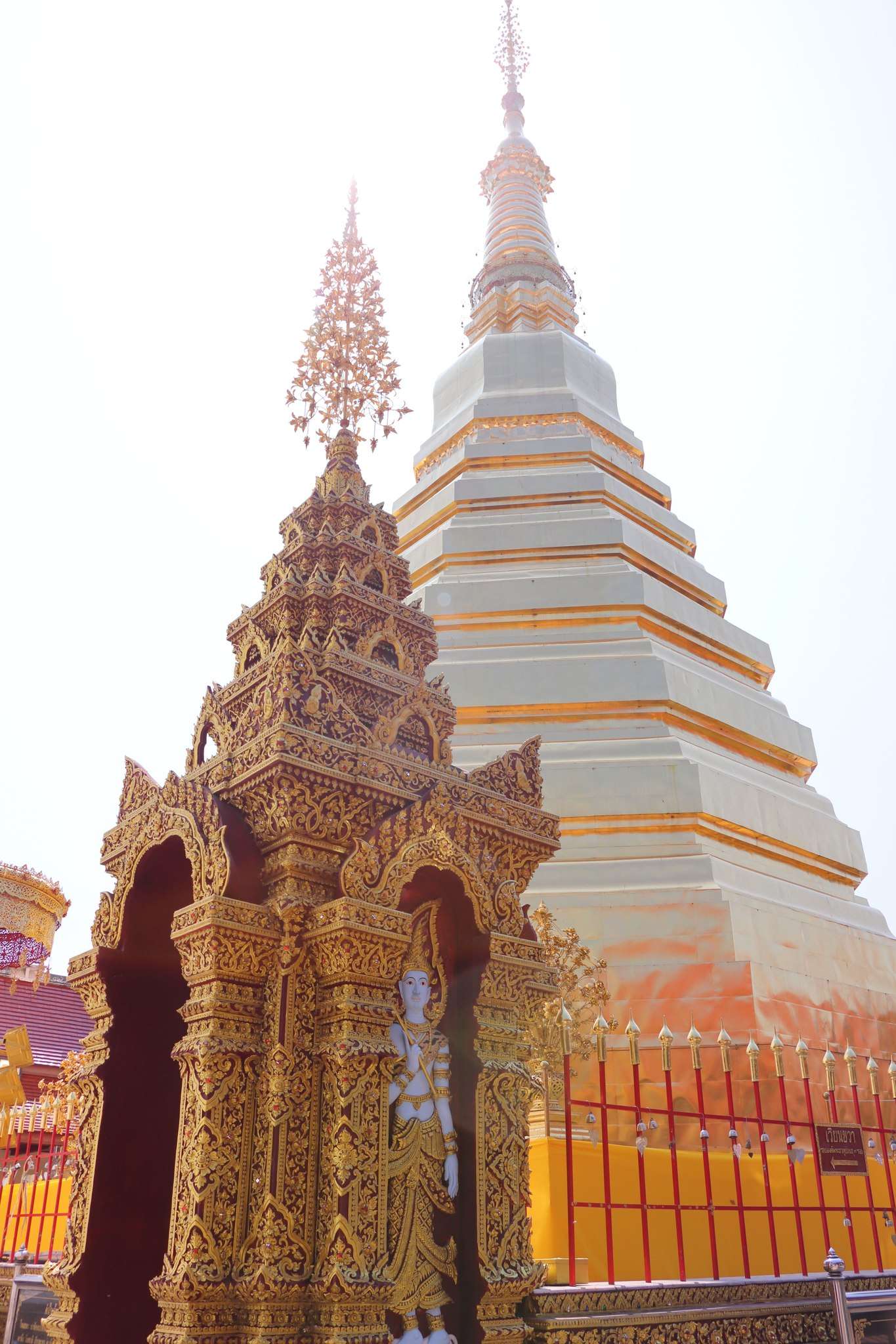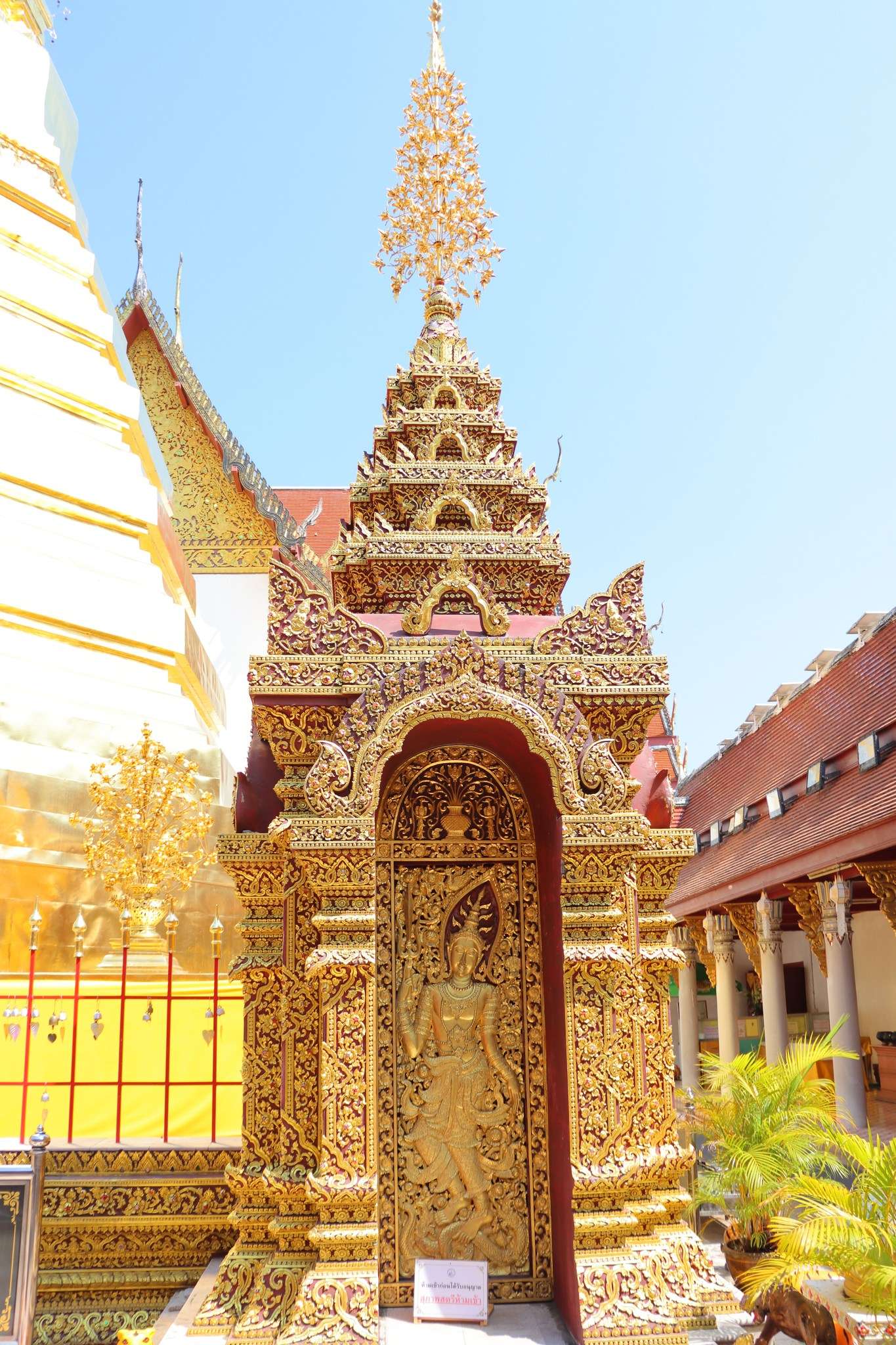 L’architecture du temple est un hommage éclatant à l’art lanna. Le chedi principal, élancé et recouvert d’or, capte la lumière comme un phare spirituel. Autour de lui, les portiques sculptés, les sanctuaires secondaires, les statues de Bouddha debout ou assis, les motifs floraux et mythologiques, tout semble avoir été pensé pour créer une harmonie entre la terre et le ciel. Les couleurs vives, les dorures, les formes élancées et les détails minutieux racontent une histoire où chaque élément a une signification, où rien n’est décoratif sans être symbolique.