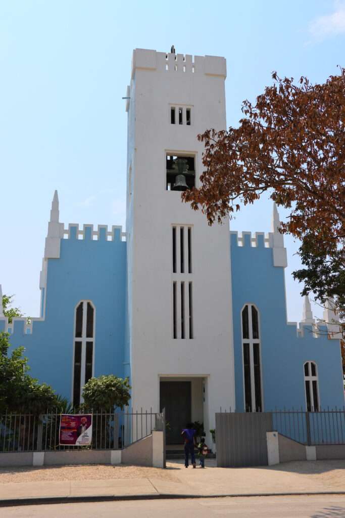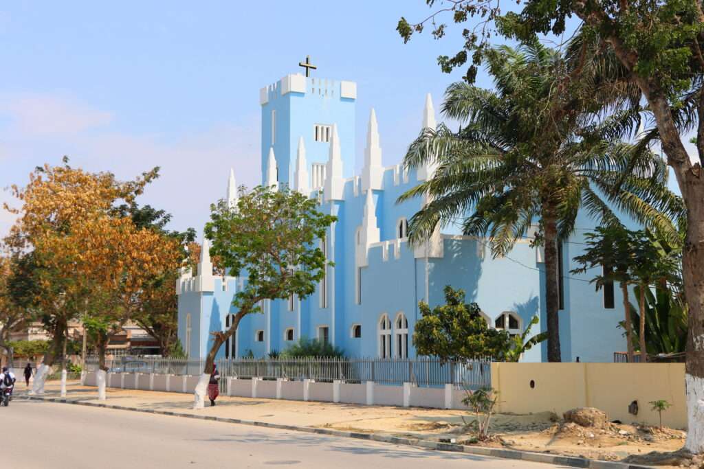 Un peu plus loin, nous atteignons l’Igreja Católica de Porto Amboim, dont la façade bleu et blanc se détache joliment sur le ciel d’un azur éclatant.