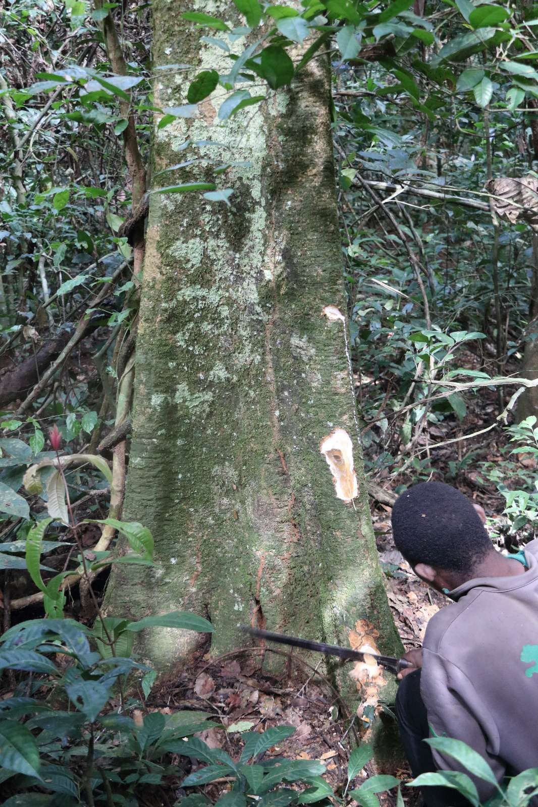 À chaque halte, Luc nous fait découvrir un pan de ce monde végétal : là, un moabi gigantesque au tronc lisse et rougeoyant, dont la graine donne une huile rare, utilisée pour nourrir et soigner les populations locales ; plus loin, un grand arbre à caoutchouc dont l’écorce, entaillée avec précaution, libère une sève blanche. Une décoction utilisée pour combattre le paludisme associé à du miel, du gingembre et du citron Il nous montre comment prélever, sans danger, l’eau claire emprisonnée dans certaines lianes rigides ; un geste salvateur quand la soif se fait sentir.