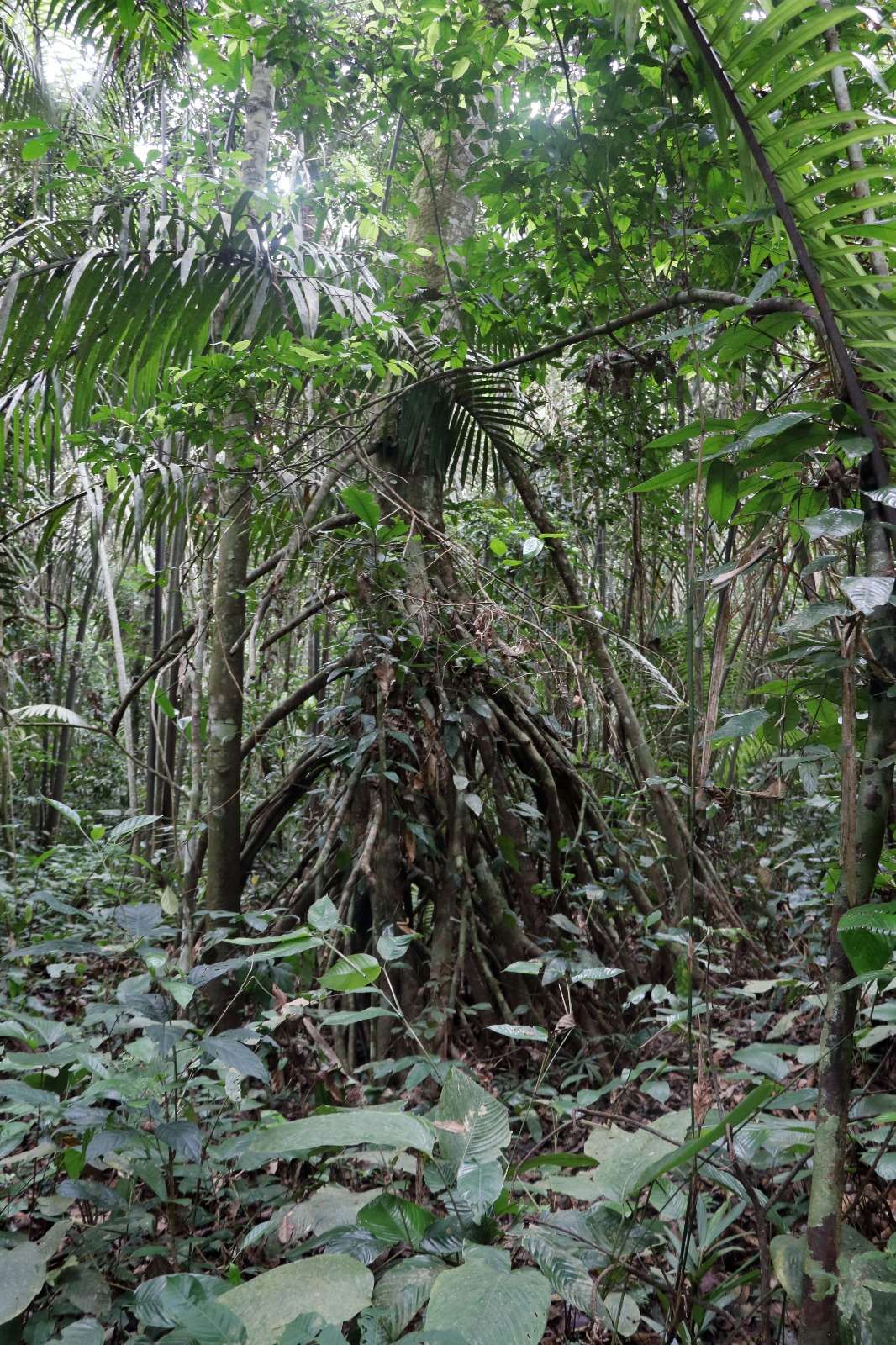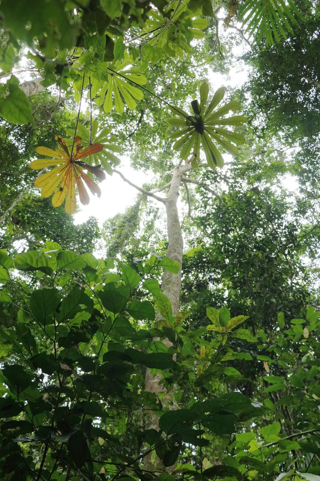 En milieu d’après-midi, nous atteignons notre campement. Les toiles s’élèvent avec célérité, et un déjeuner frugal — tranches de pain, pâte à tartiner, confiture — nous redonne des forces. Bientôt, nous repartons pour une boucle de huit kilomètres. Chaque pas nous révèle de nouveaux trésors : un groupe de singes hocheurs bondissant de branche en branche sef ait entendre mais sans qu’il ne soit possible de les apercevoir, l’éclat métallique d’un oiseau qu’on n’aperçoit qu’une fraction de seconde, un écureuil volant glissant entre deux troncs.