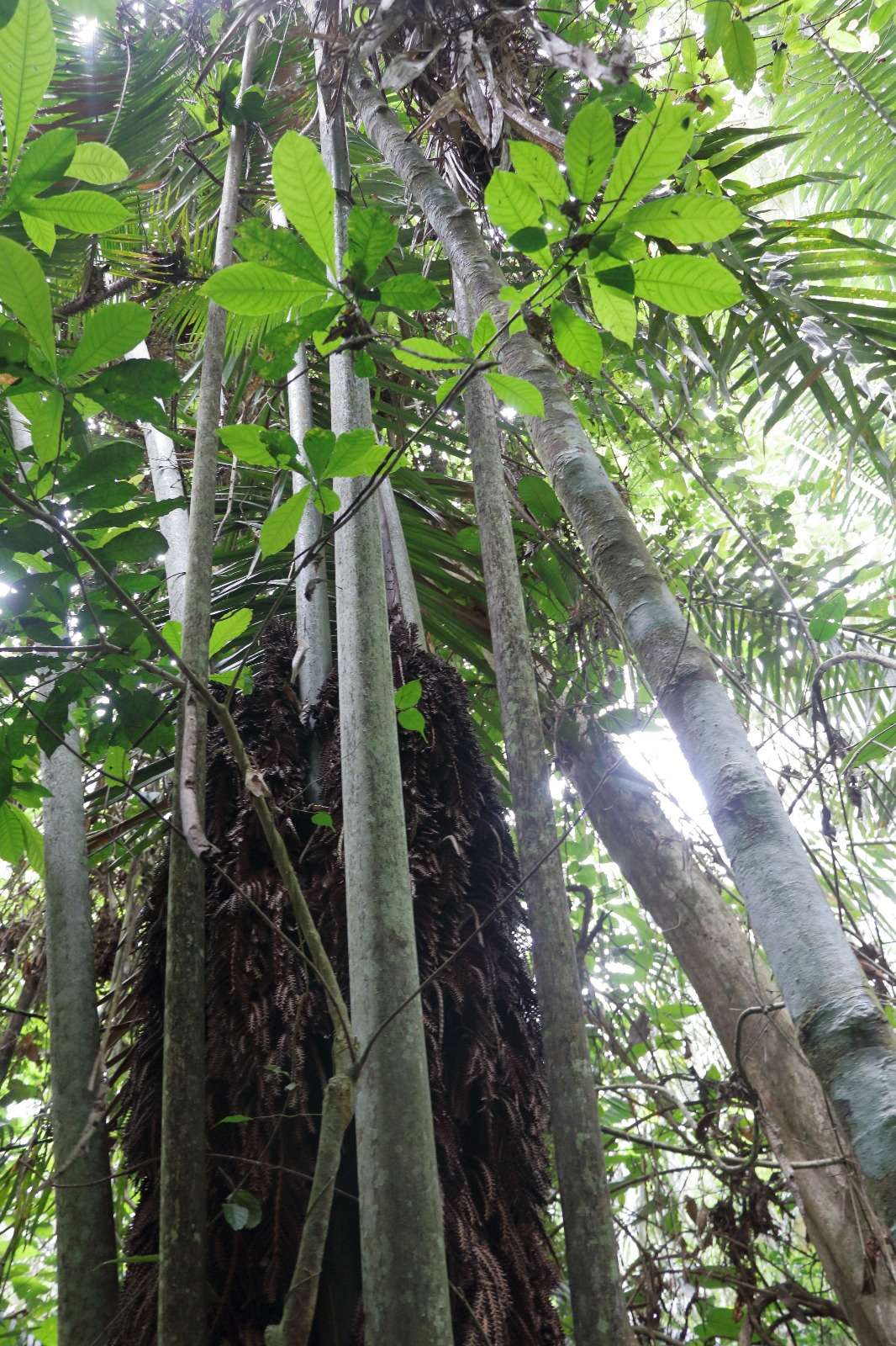Nous progressons en file indienne, guidés par Luc, sur un sentier à peine marqué que la forêt semble avaler. Des racines traîtresses et des mousses glissantes nous obligent à lever les pieds plus haut que d’ordinaire, tandis que les troncs d’ arbres tombés font office de passerelle au-dessus de petits cours d’eau ou d’obstacle à notre marche rythmée. La chaleur est présente, mais la canopée dense filtre les rayons du soleil, baignant le sous-bois d’une lumière tamisée. Nos vêtements, choisis épais, sombres et couvrants, nous protègent des ronces, des moustiques et de ce sentiment de vulnérabilité face à cette nature immense mais pas de la sueur générée par un taux d’humidité extrémement élevé