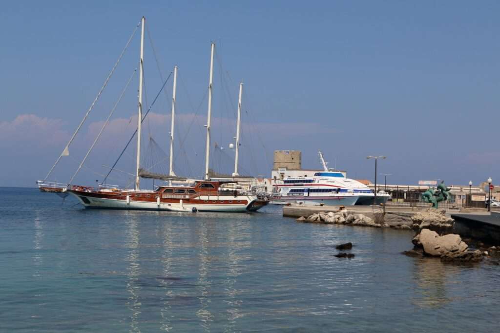 Plus au sud s’étend le port commercial, distinct du port historique, où accostent les grands ferries et les navires de croisière. Cette séparation illustre bien l’organisation portuaire héritée de l’Antiquité : Rhodes a toujours su distinguer espaces militaires, commerciaux et civils. Depuis la mer, l’approche du port offre une lecture spectaculaire de la ville : les remparts médiévaux, le palais des Grands Maîtres et les minarets ottomans se superposent dans une silhouette unique, où chaque époque a laissé sa marque.