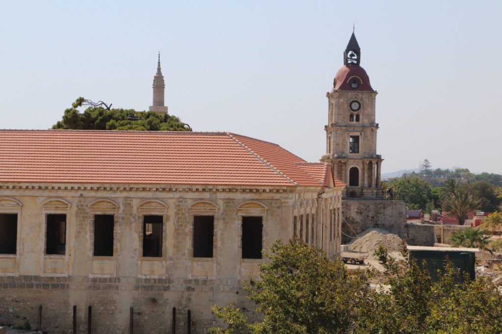 Autour de la place s’élèvent plusieurs édifices emblématiques. Le Kastellania, ancien tribunal des chevaliers, témoigne de l’organisation administrative et judiciaire de l’Ordre de Saint-Jean. Ses arcades gothiques, robustes et fonctionnelles, évoquent une époque où la justice était rendue au nom de la foi et de la discipline militaire. À quelques mètres de là, les façades aux influences vénitiennes et ottomanes racontent la succession des pouvoirs, chacun adaptant les bâtiments existants à ses propres usages plutôt que de les effacer.