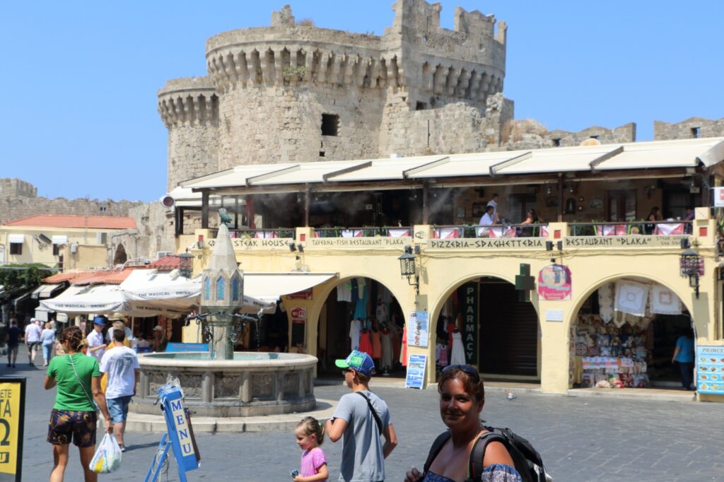 En nous attardant sur la place, nous ressentons cette superposition unique de temporalités. La place Hippocrate n’est ni un simple décor touristique ni un vestige figé : elle demeure un espace vivant, où les habitants se retrouvent, où l’on discute à l’ombre des arcades, où les enfants jouent autour de la fontaine. Elle incarne à elle seule l’esprit de Rhodes, cette capacité rare à conjuguer héritage antique, Moyen Âge chevaleresque et monde ottoman dans un même lieu, sans rupture visible.