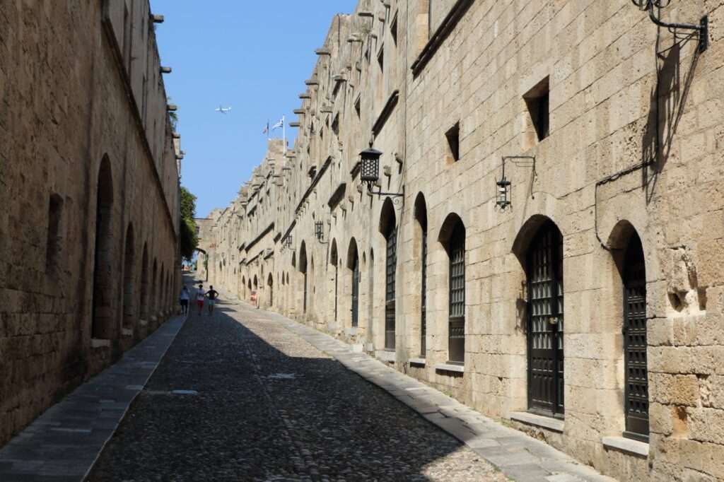 À l’intérieur, le labyrinthe de ruelles pavées nous enveloppe. Les façades gothiques des Chevaliers dominent, austères et majestueuses, ponctuées de blasons sculptés en marbre qui rappellent les différentes langues de l’Ordre de Saint‑Jean. La célèbre rue des Chevaliers (Odos Ippoton) déroule ses logis alignés, chacun marqué par son identité : Provence, Auvergne, Angleterre, Italie, Allemagne. Chaque pierre raconte une appartenance, chaque emblème une histoire de croisades et de diplomatie.