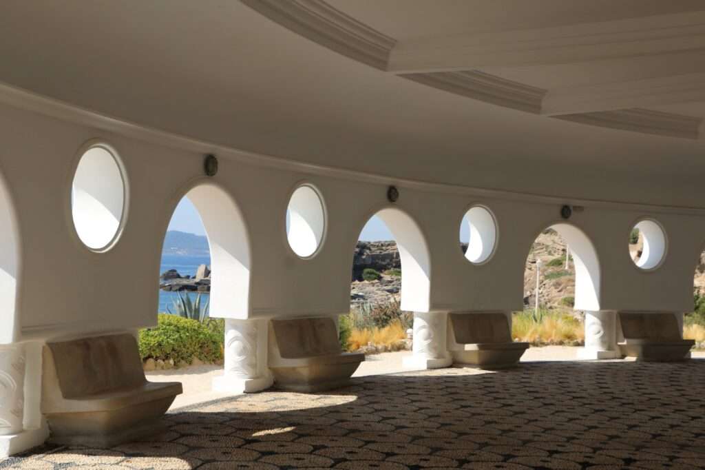 Le complexe tel que nous le découvrons aujourd’hui date principalement de la période italienne, lorsque le Dodécanèse était sous administration italienne entre 1912 et 1943. Inaugurés en 1929, les thermes furent conçus par l’architecte Pietro Lombardi, dans un style éclectique mêlant Art déco, orientalisme et références classiques méditerranéennes. Dès l’entrée, l’architecture surprend par son élégance géométrique : coupoles blanches, colonnades, arcs outrepassés et pavillons circulaires s’organisent autour d’une vaste rotonde centrale. Les mosaïques de galets noirs et blancs dessinent des motifs abstraits et marins, rappelant à la fois les thermes romains antiques et les bains orientaux.