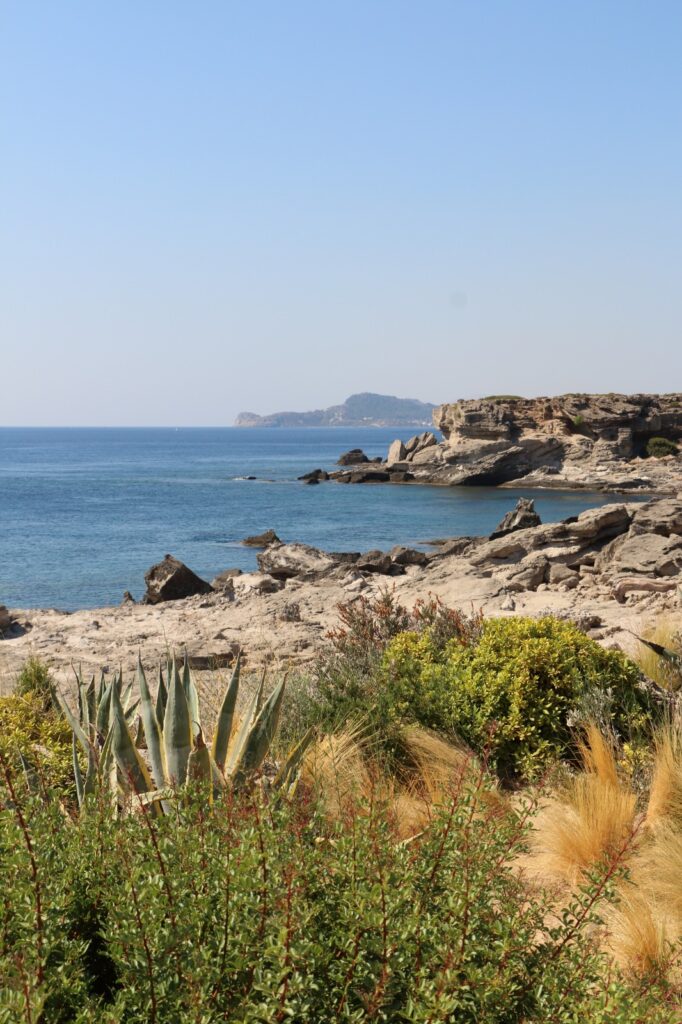 Kolimbia, en revanche, constitue un développement plus récent, amorcé au XXᵉ siècle, avec une vocation touristique assumée. La large avenue bordée d’eucalyptus qui mène à la mer constitue une signature paysagère forte, contrastant avec la garrigue environnante. Malgré l’urbanisation, le site conserve une lecture claire de la structure géographique originelle.