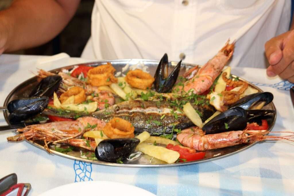 Ce soir-là, nous commandons le fameux mixed fish platter, un plateau généreux qui célèbre la pêche du jour. Il arrive fumant, posé sur un grand plat métallique, débordant de poissons grillés à la peau croustillante, de crevettes juteuses, de moules ouvertes à la vapeur, de calamars frits dorés à souhait, et de pommes de terre bouillies nappées d’huile d’olive. Chaque bouchée raconte la mer toute proche, sans artifice ni détour. C’est une cuisine franche, familiale, où la fraîcheur des produits fait tout le travail. Le vin blanc local accompagne le repas avec légèreté, et l’on savoure autant les saveurs que le moment.