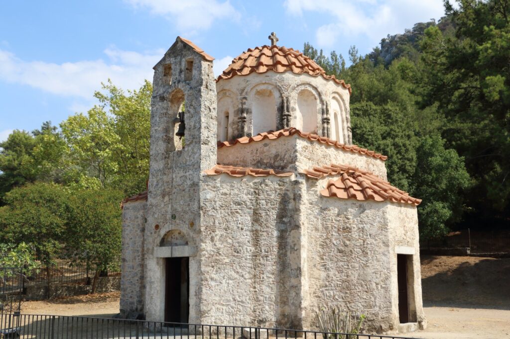 Au cœur des collines verdoyantes de Rhodes, loin des plages et des fortifications médiévales, se cache une petite église en pierre, entourée de cyprès et de pins. On y accède par une route sinueuse qui traverse les forêts du mont Profitis Ilias, et l’arrivée sur place évoque une halte monastique oubliée. L’église de Saint-Nicolas Foundoukli, construite au XVe siècle, est un exemple rare d’architecture byzantine rurale encore intacte.