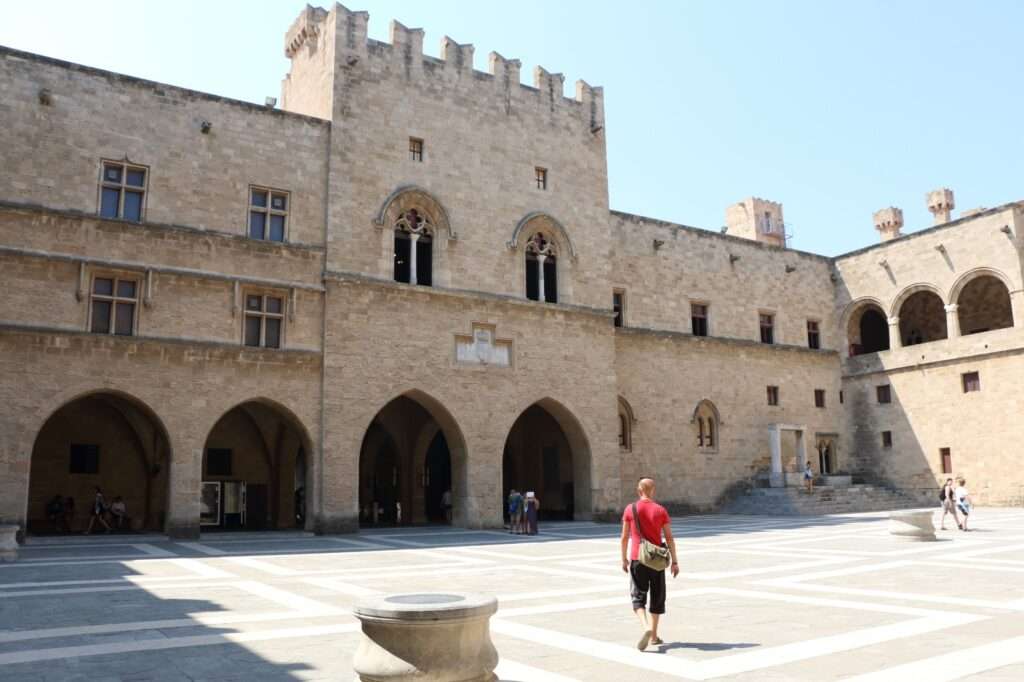 En pénétrant dans l’enceinte monumentale du Palais des Grands Maîtres, nous avons la sensation de franchir un seuil hors du temps. Cette forteresse massive, dressée au point culminant de la vieille ville, occupe l’emplacement même de l’antique acropole hellénistique, rappelant la continuité stratégique du site depuis plus de deux millénaires. Le palais fut édifié au XIVᵉ siècle par les Chevaliers de l’Ordre de Saint-Jean de Jérusalem, alors maîtres de Rhodes, non seulement comme résidence officielle du Grand Maître, mais aussi comme ultime bastion défensif en cas de siège. Dès l’approche, l’architecture impose le respect : murailles crénelées, tours angulaires, portes fortifiées et courtines épaisses traduisent une conception militaire rigoureuse, pensée pour résister aux canons ottomans et aux assauts répétés.