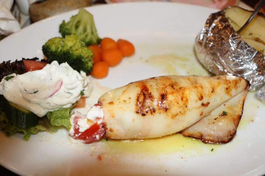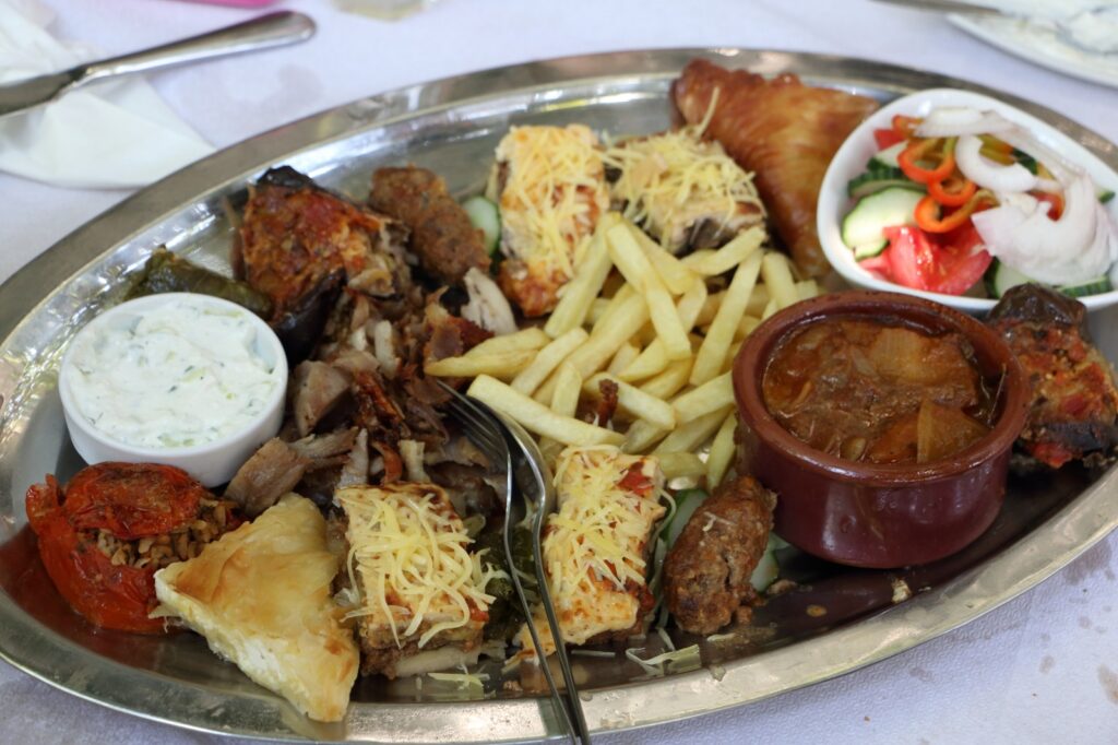 Ce soir-là, nous commandons le fameux mixed fish platter, un plateau généreux qui célèbre la pêche du jour. Il arrive fumant, posé sur un grand plat métallique, débordant de poissons grillés à la peau croustillante, de crevettes juteuses, de moules ouvertes à la vapeur, de calamars frits dorés à souhait, et de pommes de terre bouillies nappées d’huile d’olive. Chaque bouchée raconte la mer toute proche, sans artifice ni détour. C’est une cuisine franche, familiale, où la fraîcheur des produits fait tout le travail. Le vin blanc local accompagne le repas avec légèreté, et l’on savoure autant les saveurs que le moment.