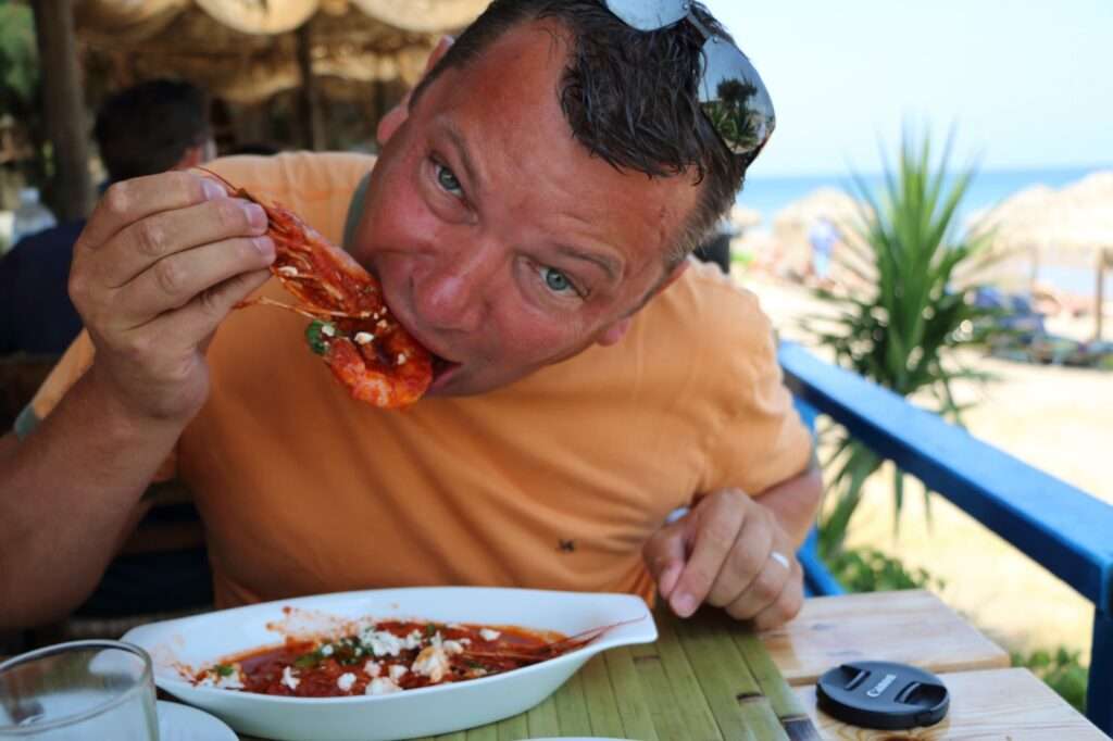 L’assiette arrive et ancre immédiatement le moment. Les gambas en sauce, nappées d’un jus rouge profond, mêlant tomate, ail et herbes, dégagent un parfum chaud et marin. La chair est ferme, parfaitement cuite, imprégnée de cette sauce que l’on ne peut s’empêcher de saucer jusqu’à la dernière goutte. Le pain pita, encore tiède, devient indispensable : on le trempe, on le replie, on partage, comme le veut la tradition grecque.