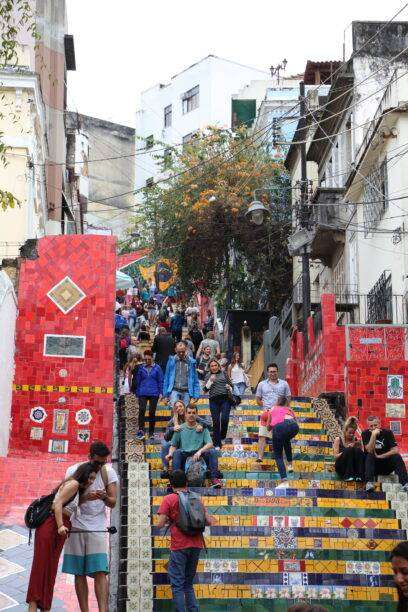 C’est l’attraction principale du centre historique. Ces escaliers dans le quartier de LAPA marque, il faut le dire, l’entrée des favelas et il faut faire bien attention à soi et à ses affaires. Mais cela vaut la peine. La rue qui y mène est entourée de murs peints. Elle débouche sur les magnifiques escaliers faits de mosaïques de couleurs. C’est grandiose, et évidemment très touristique
