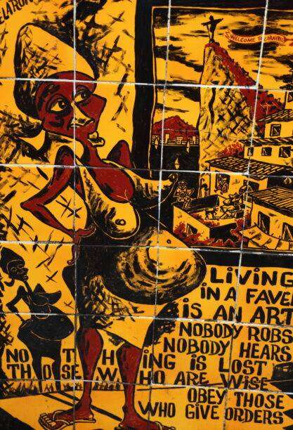 La route qui monte vers SANTA TERESA est d’ailleurs sérieusement déconseillée aux touristes. Nous optons pour la traversée de la place CARDEAL CAMARA le long de l’avenue Mem de Sa, vers la rue Teotonio Regadas. Les façades ici sont peintes et racontent la vie locale de manière humoristique