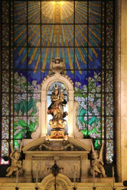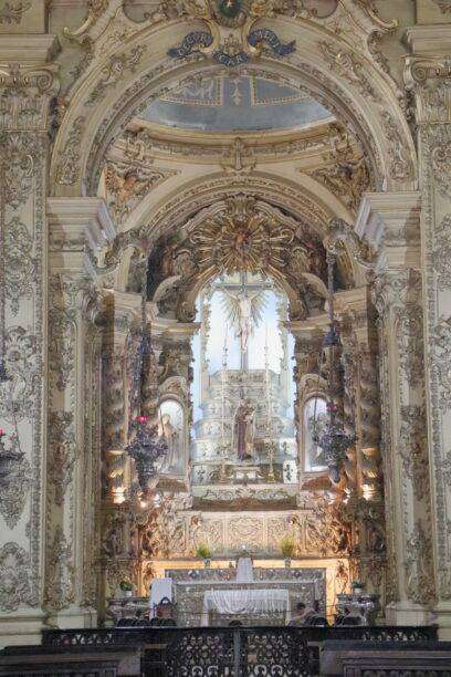 En franchissant le seuil, nous avons l’impression d’entrer dans un autre temps. L’intérieur, intime et raffiné, respire la dévotion des confréries de marchands qui l’ont fondée au XVIIIᵉ siècle. Les murs racontent leur histoire : celle d’une communauté de commerçants portugais qui, entre foi et prospérité, voulaient offrir à la ville un lieu de prière à leur image. La lumière glisse sur les dorures, les autels sculptés, les peintures délicates. On sent la main des artisans, la patience des restaurateurs, la fidélité des fidèles qui ont traversé les siècles.