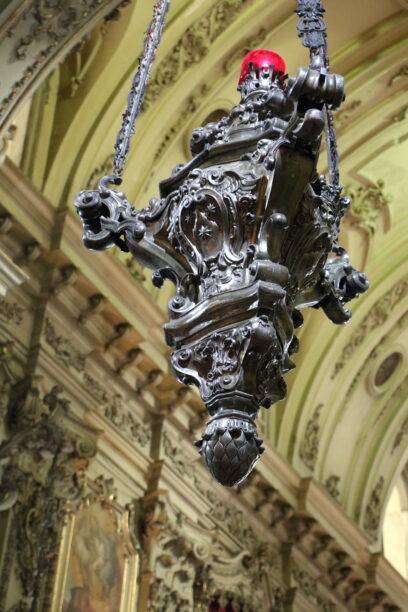 À l’intérieur, la richesse décorative frappe immédiatement. Les boiseries sculptées, les dorures, les autels ornés et les fresques témoignent du savoir-faire des artisans du XVIIIᵉ et du XIXᵉ siècle. Chaque détail semble raconter une histoire : les colonnes torsadées évoquent la ferveur baroque, les angelots dorés rappellent la splendeur des cours royales, et les chapelles latérales abritent des retables où la lumière joue avec les dorures.