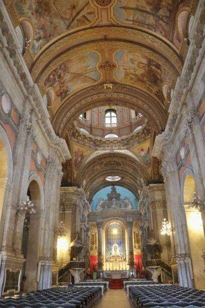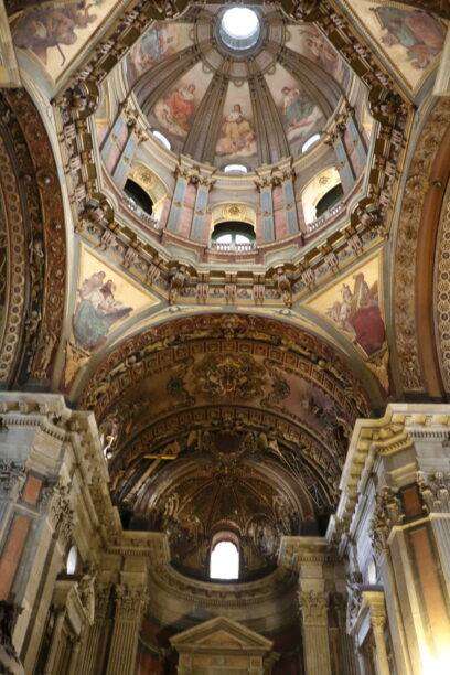 Lorsque nous franchissons les portes, l’intérieur nous enveloppe immédiatement. La lumière glisse sur les marbres, les dorures, les fresques, les sculptures. Tout est richement décoré, mais jamais écrasant. On lève les yeux, et les voûtes peintes semblent flotter au-dessus de nous comme un ciel intérieur. Les chapelles latérales, les autels, les vitraux : chaque détail raconte une époque, un artisan, une intention.