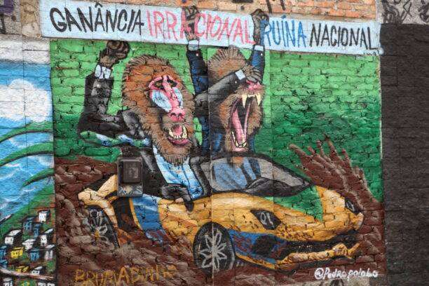 Nous choisissons donc une autre voie, plus vivante et plus sûre : la traversée de la place Cardeal Câmara, le long de l’avenue Mem de Sá. Ici, l’ambiance change radicalement. Les façades des immeubles, couvertes de fresques et de peintures murales, racontent la vie locale avec humour et fantaisie. Les scènes de rue, les personnages caricaturaux, les couleurs éclatantes donnent à ce passage une atmosphère joyeuse et décalée, comme si la ville elle-même se mettait à sourire.