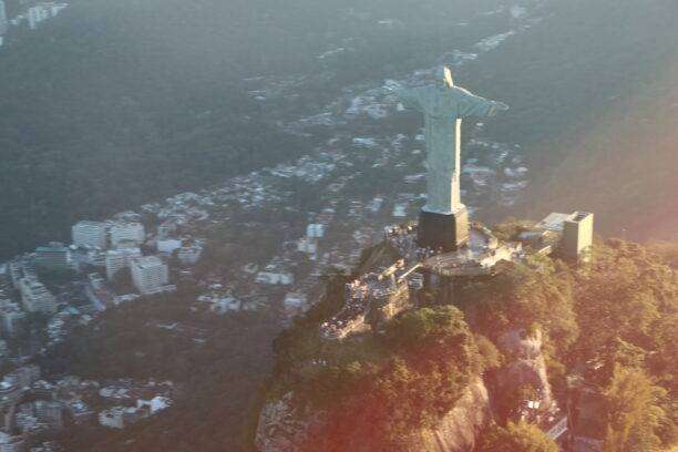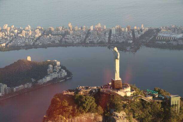 Très vite, nous atteignons le Mirante de Leblon, porte d’entrée vers les superbes rubans de sable de Leblon et Ipanema, tandis qu’à gauche s’étend le Lagoa Rodrigo de Freitas, éclatant comme une gemme turquoise au cœur de la ville. Nos yeux s’élèvent ensuite vers le piton rocheux qui surgit devant l’appareil : le Cristo Redentor, bras ouverts, semble illuminé par le soleil de manière divine. L’hélicoptère en fait plusieurs fois le tour, offrant des perspectives toujours renouvelées, et chaque virage nous donne l’impression de flotter dans une étreinte céleste.