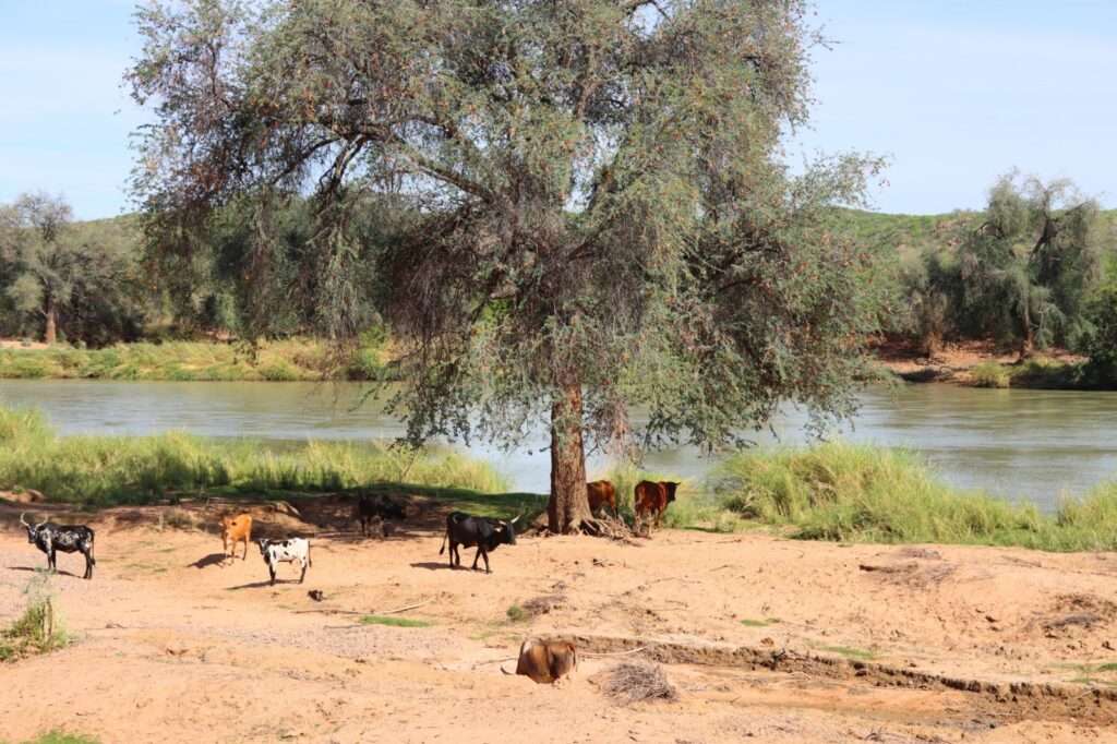 Nous quittons Oshakati vers neuf heures, sous un ciel déjà limpide et un soleil bien installé. La route vers Ruacana est entièrement goudronnée, régulière et agréable, traversant une savane arbustive où les mopanes dominent. Le paysage, quoique monotone à première vue, révèle une beauté discrète : arbres torsadés, termitières rougeâtres, et parfois, au détour d’un virage, un troupeau de chèvres escorté par quelques enfants curieux.