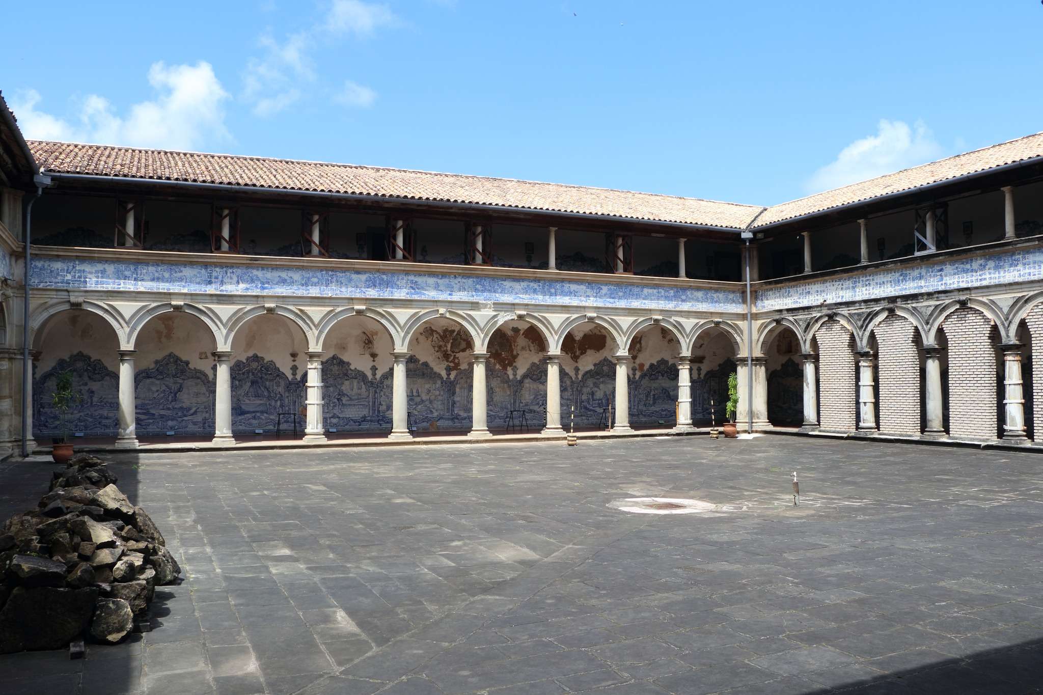 En pénétrant dans le cloître du couvent, le registre change, sans perdre en profondeur symbolique. Les galeries s’organisent autour d’un vaste espace central, décoré d’azulejos d’une finesse remarquable. Ces carreaux de faïence bleus et blancs racontent des scènes morales, des allégories, des récits édifiants destinés à instruire autant qu’à embellir. À mesure que nous les observons, une autre lecture se révèle, plus discrète, presque subversive. La tradition orale raconte que certains visages auraient été volontairement déformés par les esclaves chargés de la pose, comme un geste de protestation silencieuse, imperceptible au premier regard mais chargé de sens.