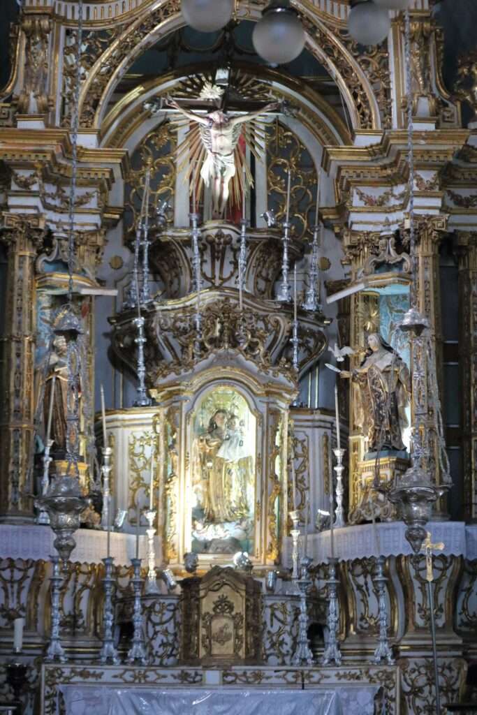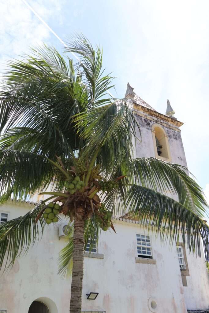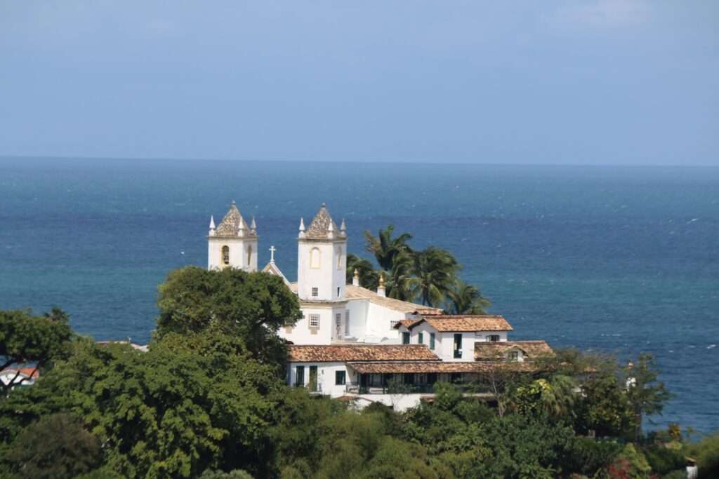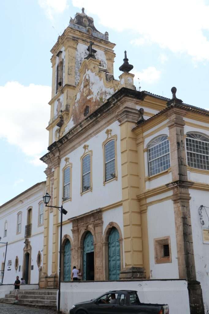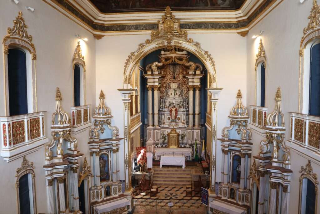 À l’intérieur, notre attention se porte sur la talha et les retables : dorures, sculptures et boiseries témoignent d’ateliers locaux et d’un goût baroque adapté au climat et aux matériaux de la région. Les tours sineiras et les toitures pyramidales encadrent la façade, tandis que l’escalier extérieur menant à l’étage rappelle des solutions constructives propres aux premières églises bahianaises. Les interventions successives — du maniérisme au baroque, puis à des touches néoclassiques — se lisent comme des couches d’histoire, chacune ajoutant sa voix au récit du lieu.