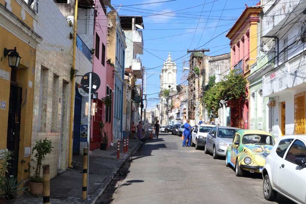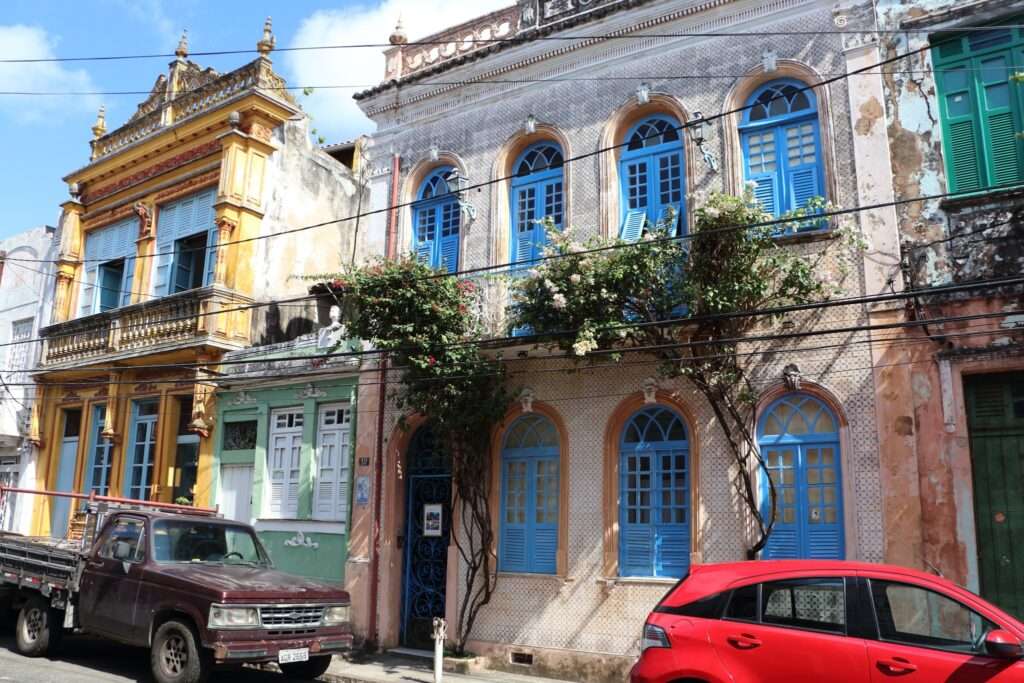 L’architecture de la Rua Direita de Santo Antônio impose immédiatement un rythme visuel très lisible. Les maisons, étroites et alignées sans interruption, suivent le modèle lusitanien adapté au contexte tropical : rez-de-chaussée fonctionnel, étage noble, parfois surmonté d’un grenier discret. Les façades, peintes de tons pastel — bleu céladon, rose fané, ocre chaud, jaune lumineux — forment une palette continue, accentuée par les encadrements blancs des ouvertures. Les balcons en fer forgé, finement travaillés, témoignent d’un savoir-faire importé du Portugal mais enrichi localement, servant à la fois d’ornement, de ventilation et d’interface sociale entre l’espace privé et la rue.