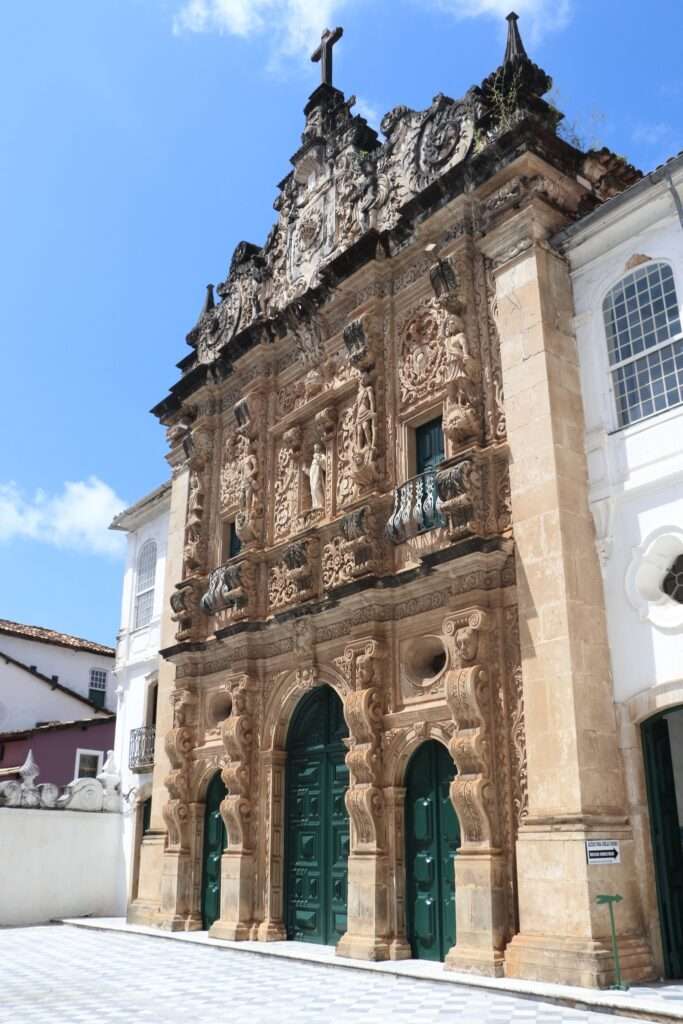 La façade est un cas unique au Brésil. Elle adopte le style plateresque, un langage décoratif issu de la Renaissance espagnole, dont le nom évoque le travail minutieux des orfèvres. La pierre est sculptée comme un métal précieux : colonnes torsadées, niches, volutes, motifs végétaux et figures symboliques s’enchevêtrent dans une composition dense et savamment équilibrée. Contrairement aux façades baroques plus massives et théâtrales de Salvador, celle-ci privilégie le détail, l’ornement ciselé, invitant à une lecture lente, presque tactile.