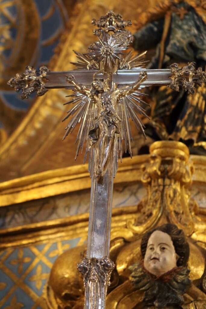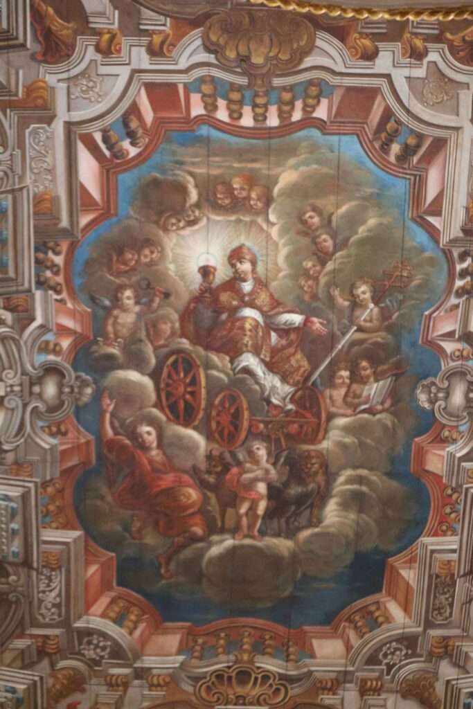 L’architecture intérieure nous submerge immédiatement. Les murs, les retables, les colonnes, les chapiteaux, les arcs : tout est recouvert de feuilles d’or, plus de huit cents kilos appliqués avec une minutie presque obsessionnelle. L’or ne sert pas seulement à décorer ; il capte la lumière, la diffuse, la multiplie, transformant l’espace en une vision presque irréelle. Les plafonds en trompe-l’œil achèvent de troubler les repères. Peints avec une maîtrise vertigineuse, ils ouvrent des ciels imaginaires au-dessus de nos têtes, où anges, nuées et architectures fictives prolongent l’église au-delà de ses limites matérielles.