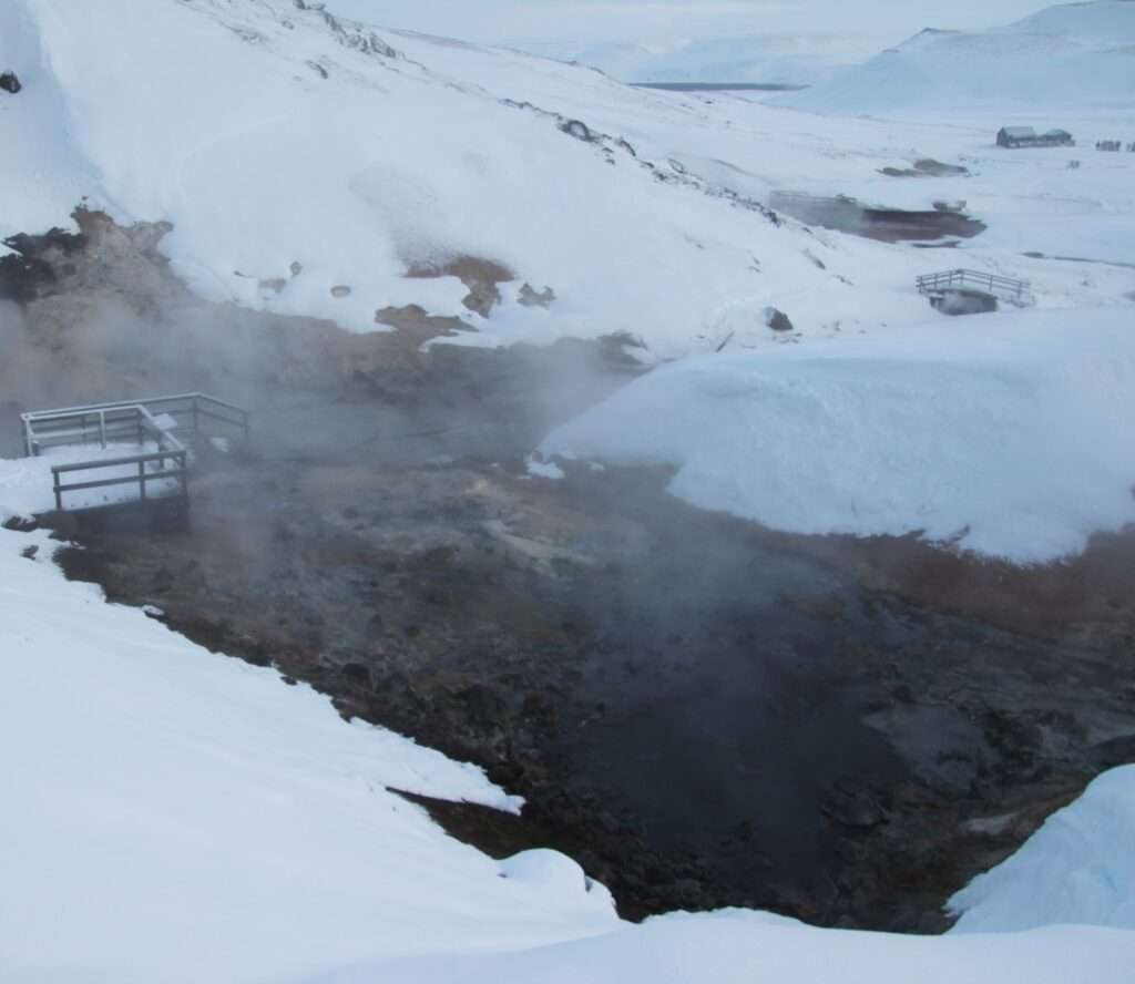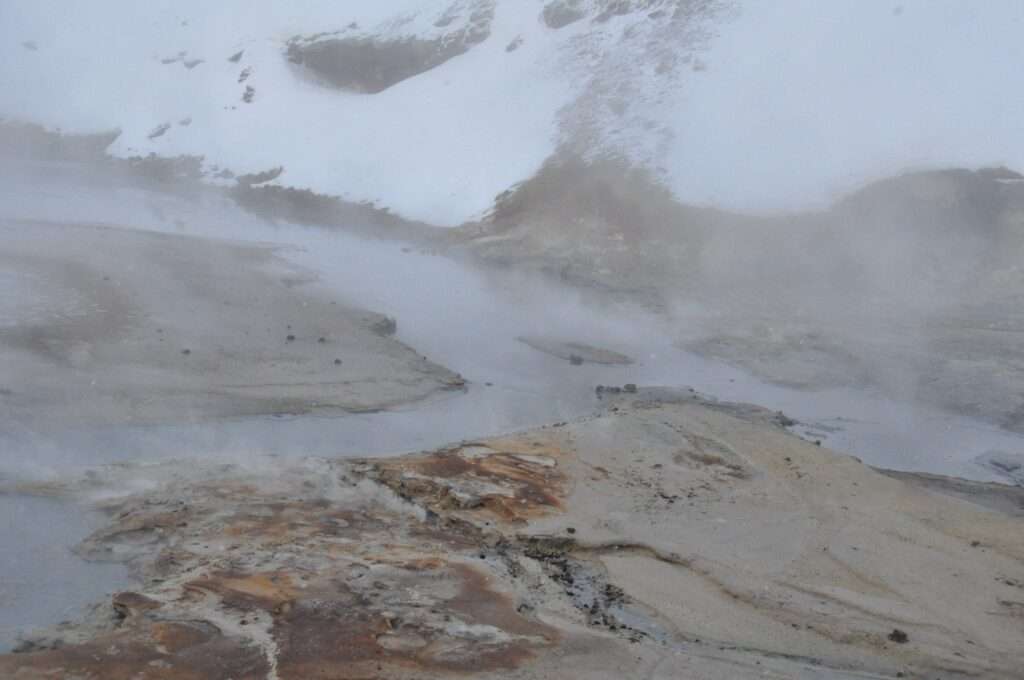 Nous restons fascinés par la puissance brute de ce site, symbole de l’énergie géothermique islandaise, qui alimente depuis des décennies les villages et villes en électricité et en chaleur. Tout autour, la neige contraste avec les teintes vives des sols, accentuant le caractère irréel du lieu et nous plongeant dans une sensation de monde à part, où la nature domine totalement.