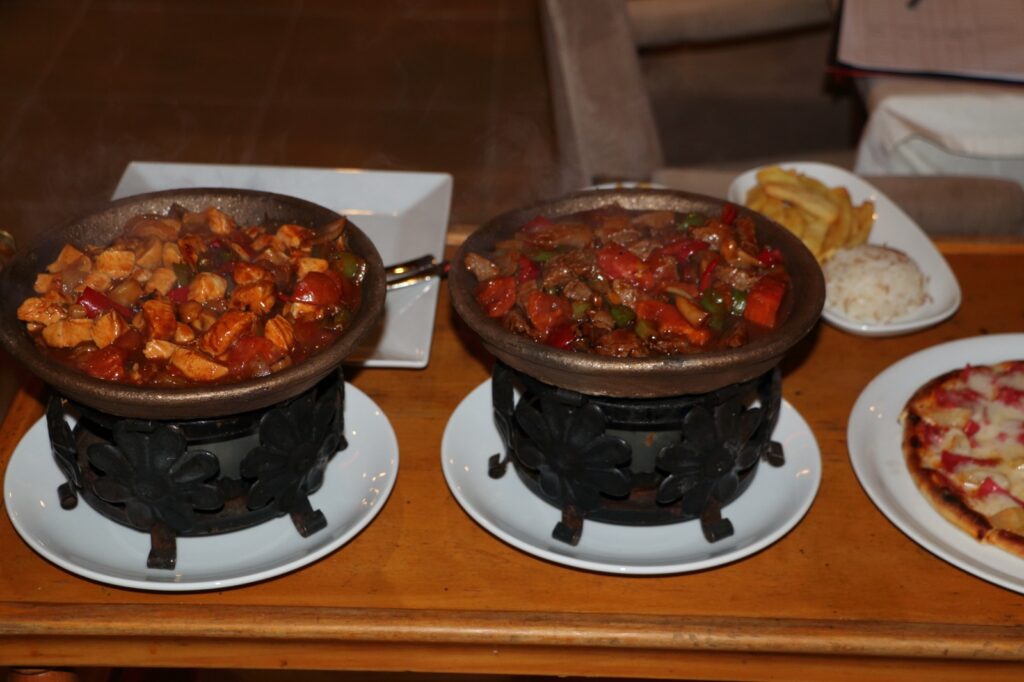 En plat principal, nous choisissons le tavuk güveç, un ragoût de poulet mijoté dans une poterie brûlante, avec tomates, poivrons, oignons et épices douces. Le plat arrive encore fumant, posé sur son support de métal ouvragé, et libère un parfum de thym et de paprika. À côté, le et sote de bœuf, plus corsé, mêle viande tendre et légumes fondants dans une sauce tomate légèrement relevée. Le riz blanc, les frites dorées et une petite pizza turque au fromage complètent l’assiette, dans une abondance joyeuse.