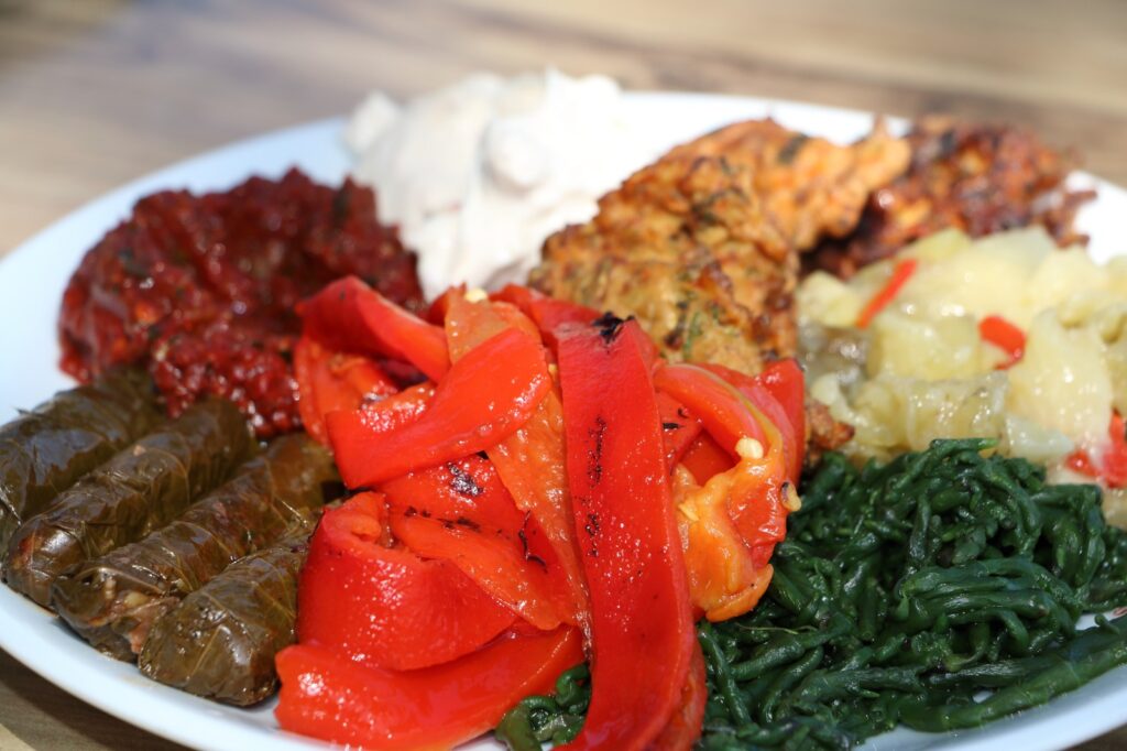Le repas commence par une farandole de mezzés : feuilles de vigne farcies au riz citronné, poivrons grillés, purée de pois chiches au tahini, yaourt à l’ail, salade de tomates concassées au sumac, et légumes frits servis tièdes. Les couleurs sont vives, les textures variées, et chaque bouchée évoque les potagers en terrasse et les recettes transmises entre générations.