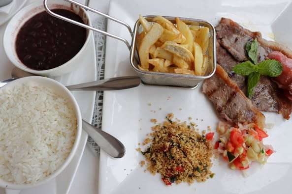 • 🔥 Pincanhas de bœuf : servies en tranches épaisses, légèrement rosées, avec farofa, banane frite et une touche de citron vert. La viande est juteuse, bien saisie, et le plat s’inscrit dans une tradition de grillade lusophone, entre Brésil et Angola.