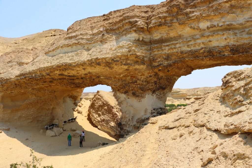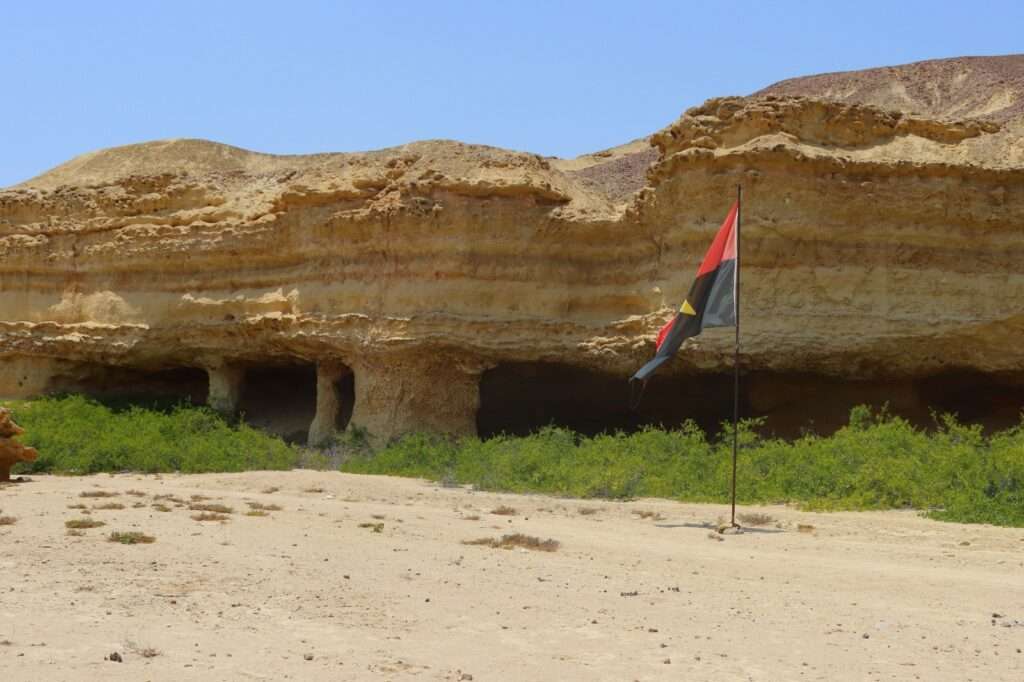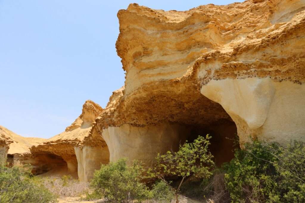 Nous suivons un sentier sableux qui serpente entre les formations rocheuses, bordé de végétation éparse et de cavités creusées dans la pierre.