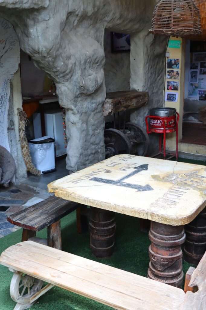 Pour le déjeuner à Tombwa, nous suivons les conseils locaux et nous arrêtons à O Bar Virei, un lieu atypique, à la fois restaurant, musée vivant et carnet de voyage collectif. Niché dans une rue sablonneuse, ce bar ne se contente pas de servir des plats : il raconte des histoires, conserve des traces, expose des fragments de vie.