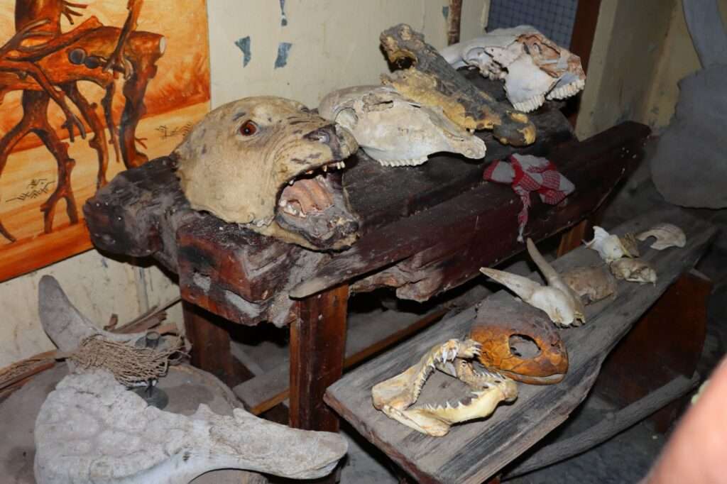 Chaque recoin est occupé : crânes d’animaux sauvages, peaux de bêtes, tortues naturalisées, serpents séchés, coquillages, bornes kilométriques, photos de voyageurs, monnaies du monde, objets rouillés, lampes à pétrole, bois flotté, nids d’oiseaux, tableaux animaliers, arcs et flèches. C’est un musée improvisé, un cabinet de curiosités du désert, un lieu de mémoire collective.