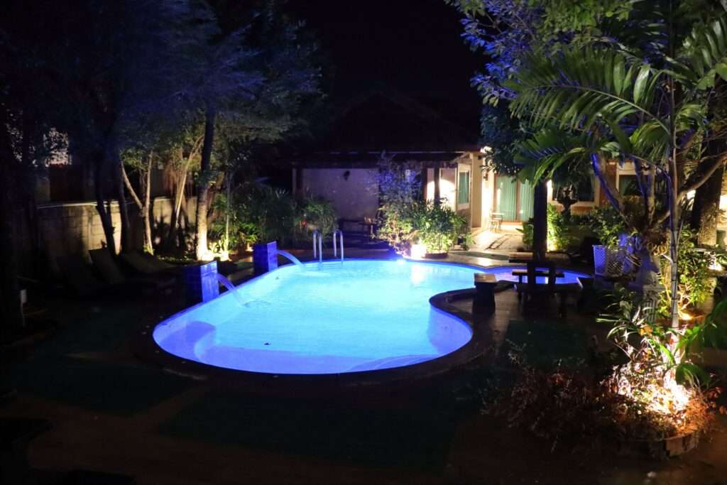 À l’extérieur, l’ambiance se transforme dès la tombée de la nuit : les allées bordées de végétation tropicale s’illuminent de lampes discrètes, créant une atmosphère feutrée propice aux promenades. La piscine, véritable joyau du lieu, scintille sous les lumières, entourée de chaises longues et de jardins luxuriants. Le jour, elle devient un refuge rafraîchissant, et le soir, un décor apaisant où l’on se laisse bercer par le murmure des jets d’eau.