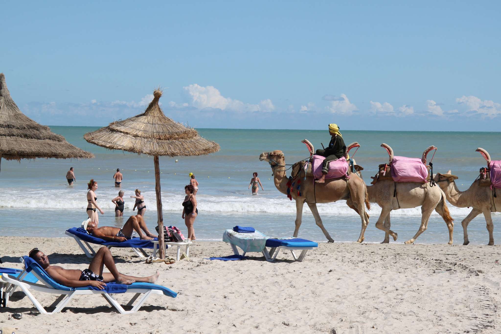 Rapidement, nous partons explorer les lieux. La grande piscine, bordée de transats et de palmiers, semble nous tendre les bras. Mais c’est du côté de la plage privée, à deux pas, que nous nous dirigeons. Le sable est doux, presque blanc, et la Méditerranée nous offre ses reflets turquoise. Quelques pêcheurs au loin, des dromadaires nonchalamment installés sous les tamaris, et le doux clapotis des vagues… Nous y sommes. Les vacances peuvent commencer.
