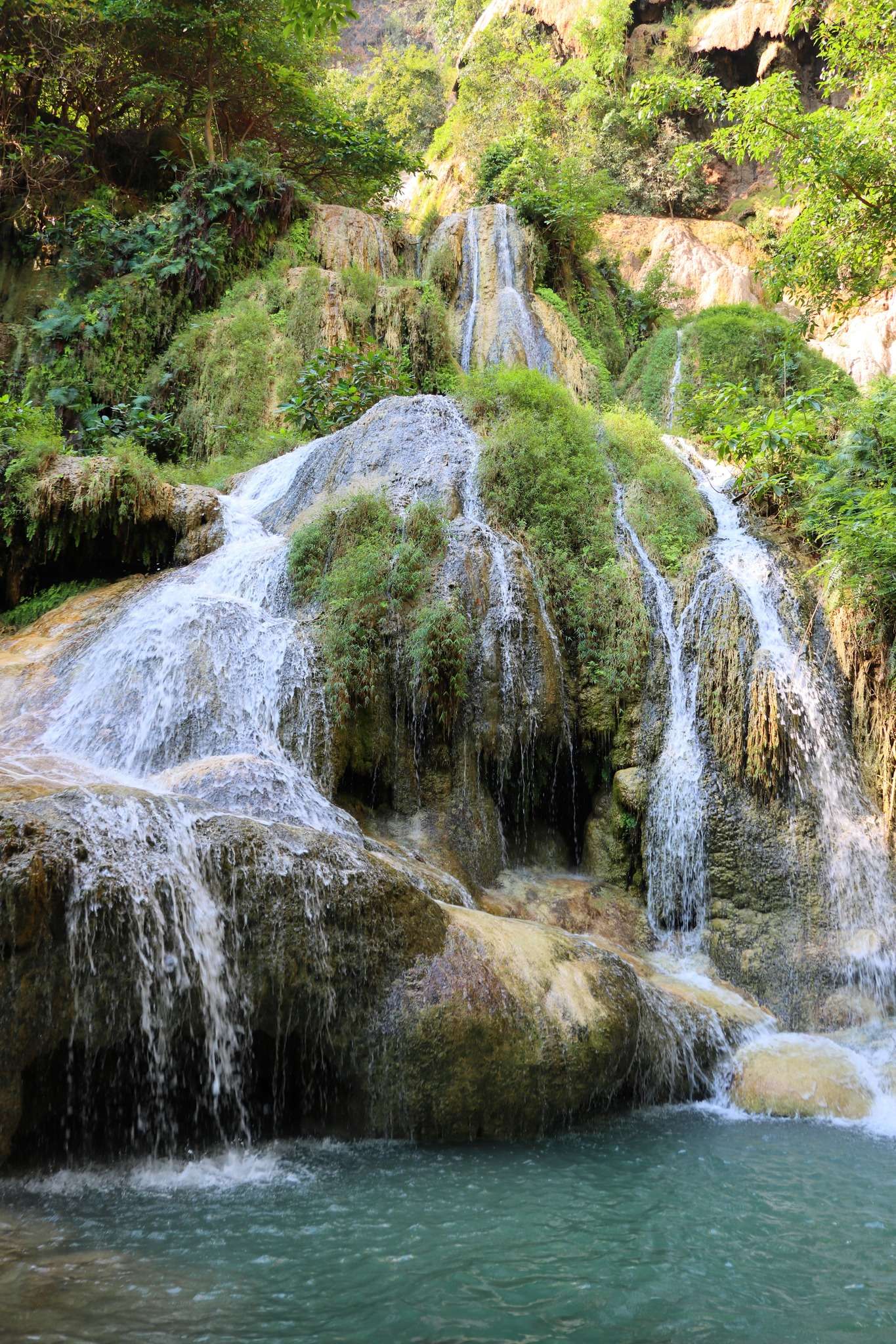 Rapidement, nous entrapercevons les premiers bassins naturels et les glissades d’eau. La limpidité est étonnante : un vert émeraude à couper le souffle. Dans ces eaux claires évoluent de nombreux poissons, notamment le Mahseer barbey (Neolissochilus stracheyi), appartenant à la famille des Cyprinidés. Avec ses deux paires de barbillons, son corps allongé brun‑vert et ses nageoires puissantes, il peut atteindre 25 cm, parfois davantage. Ces poissons, proches des carpes, vivent dans les grandes rivières aux eaux limpides et accompagnent les baigneurs dans une expérience unique.