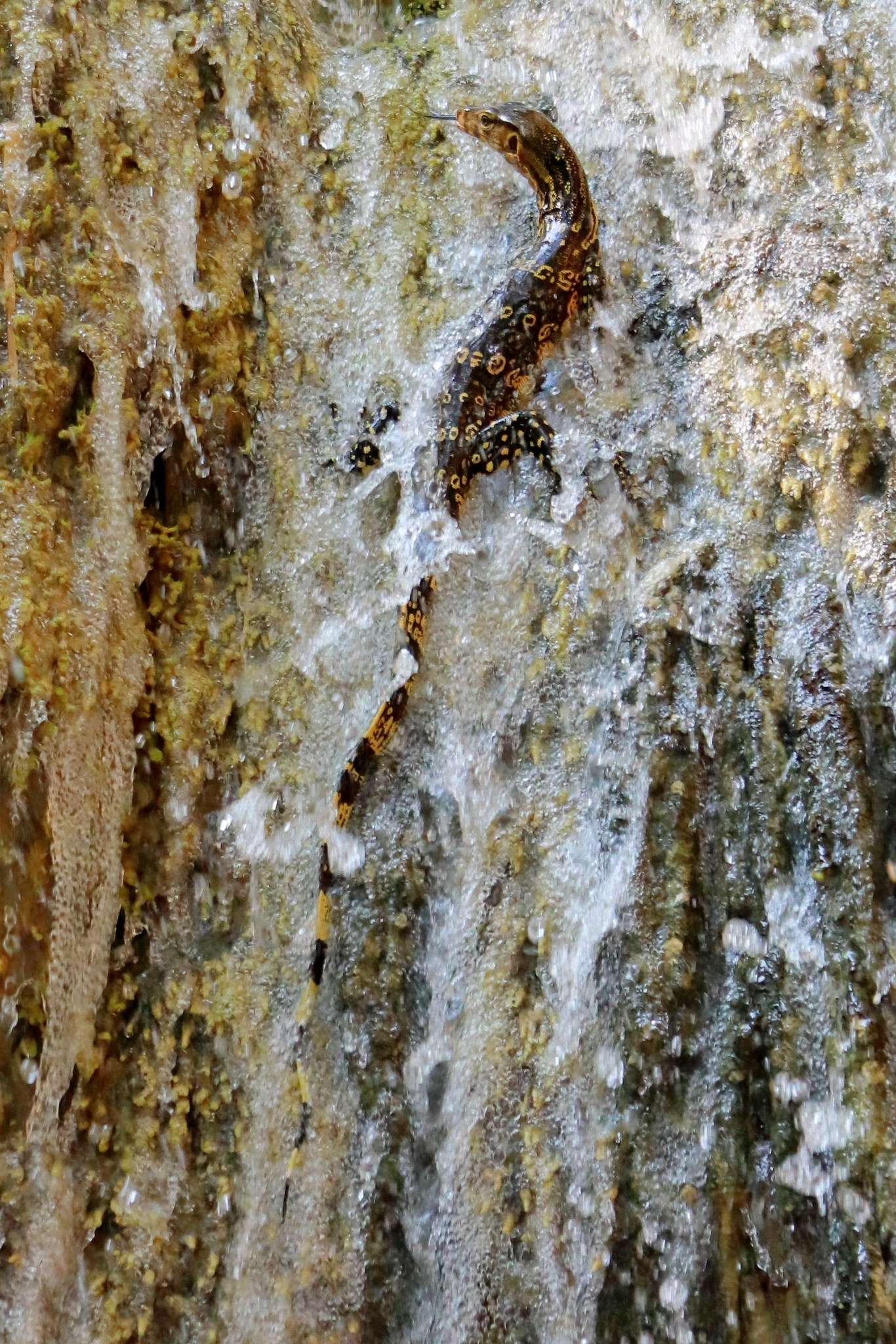 Enfin, le septième niveau, Phu Pha Erawan, conclut l’ascension dans une atmosphère presque sacrée. Les formations calcaires y sont spectaculaires, sculptées par les eaux des ruisseaux Mong Lai et Omtala. Les bassins cristallins invitent à la baignade, mais le silence profond et l’humidité dense donnent au lieu une aura mystique. C’est là que nous apercevons un Varan malais (Varanus salvator), reptile impressionnant pouvant dépasser deux mètres. Sa peau sombre ponctuée de motifs jaunes et ses narines situées au bout du museau en font un maître des lieux, parfaitement adapté aux rochers mouillés et à l’environnement aquatique. Sa présence rappelle que la nature, ici, reste souveraine et indomptable.
