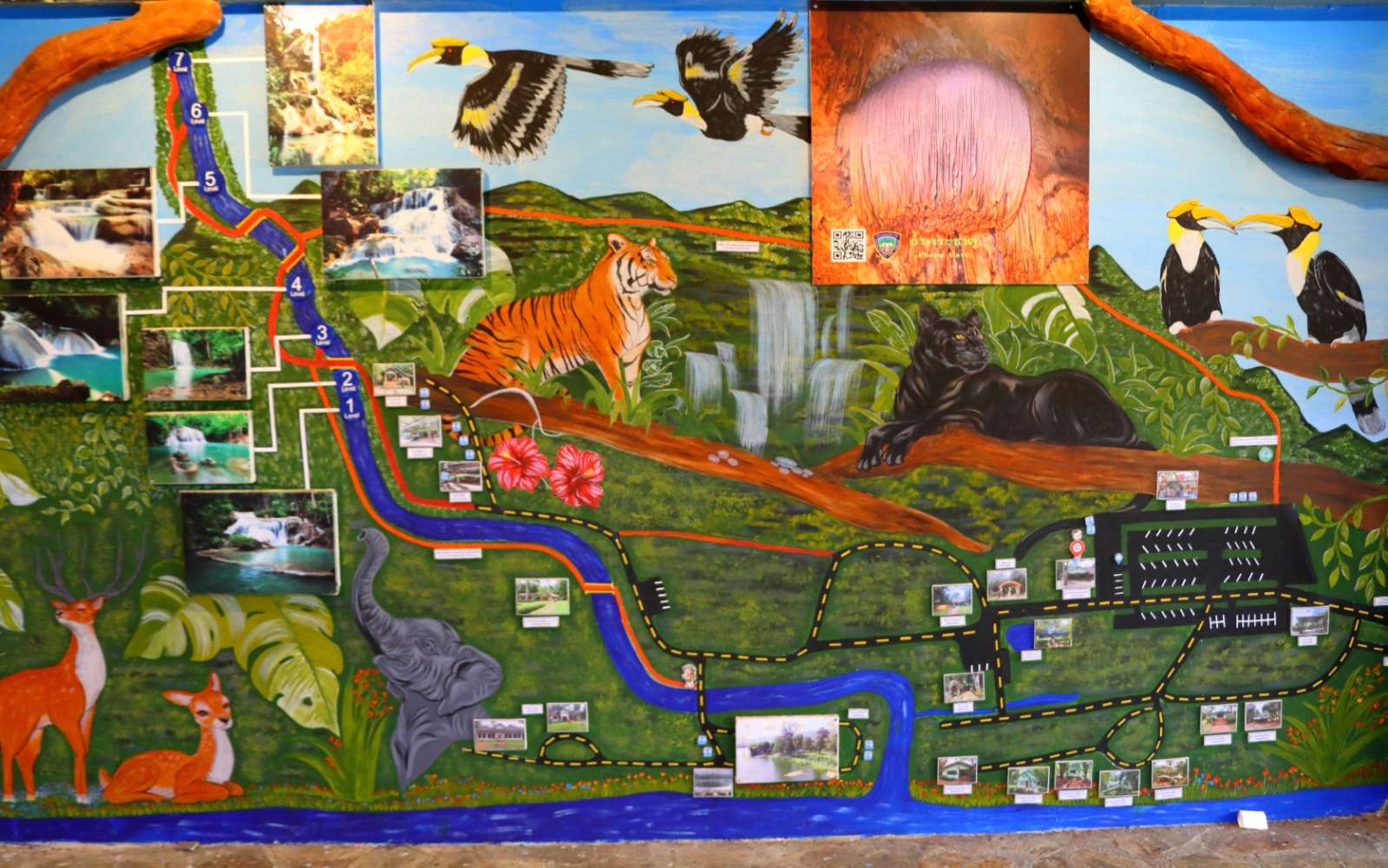 Le sixième niveau, Dong Phueksa, est dominé par la végétation. Les grands arbres et les fougères variées forment une voûte dense, et les formations calcaires uniques ajoutent une dimension géologique fascinante. Un belvédère aménagé permet d’embrasser du regard l’ensemble de l’écosystème : l’eau qui s’écoule, la forêt qui s’étend, et les reliefs qui se dessinent dans la lumière.