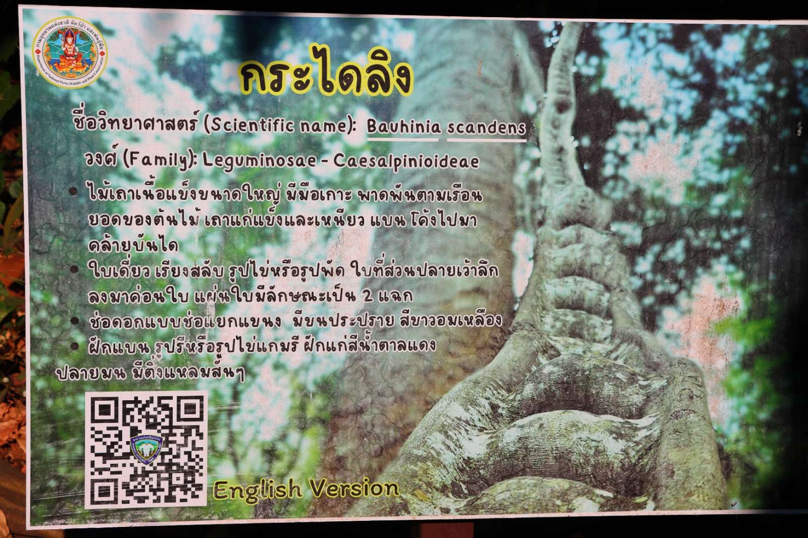 Dès les premiers pas, la flore locale nous émerveille. Nous découvrons notamment l’échelle de singe (Bauhinia scandens), une grande liane ligneuse de la famille des Légumineuses. Ses vrilles s’accrochent aux arbres, ses extrémités matures sont dures et recourbées, semblables à un escalier naturel. Ses feuilles bifurquées, ses fleurs blanc jaunâtre et ses gousses brun rougeâtre complètent ce portrait végétal fascinant.