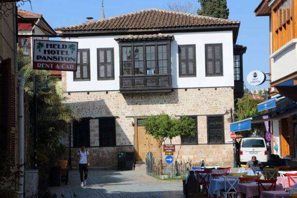Nous déambulons sans hâte dans le dédale des ruelles de Kaleiçi, où les façades colorées alternent avec des maisonnettes ottomanes aux bow‑windows en encorbellement, dits oriels, qui permettaient aux habitantes de surveiller la rue sans être vues. Ces demeures, pour la plupart restaurées aux XVIIIᵉ et XIXᵉ siècles, abritent aujourd’hui des boutiques d’artisanat, des galeries d’art et de charmants boutique‑hôtels.