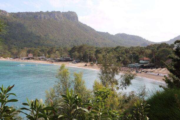 Nous arrivons à Phaselis après une route sinueuse par la D400 reliant Antalya à Kemer. Au détour d’un virage, la forêt de pins cède la place à de larges anses turquoises et au Mont Olympos (Tahtalı) qui se dessine à l’horizon. La chaleur moite de la journée est ponctuée par le chant des cigales et une légère brise chargée de l’odeur des pins, des romarins et du jasmin sauvage. L’architecture de la cité antique, dissimulée sous ses chapeaux de pins, se révèle peu à peu : nous distinguons au loin les vestiges blancs d’un ancien aqueduc romain qui surplombent le littoral. Après environ une heure de route depuis Antalya, nous plongeons dans l’atmosphère intemporelle de Phaselis