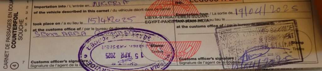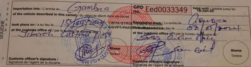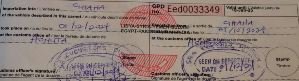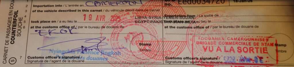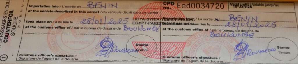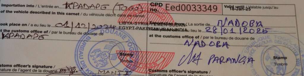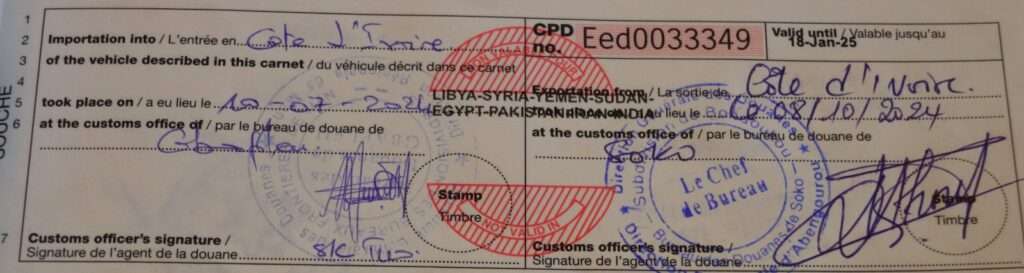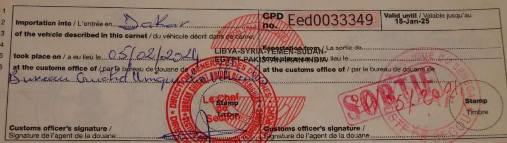 Si le véhicule est couvert par un Carnet de Passages en Douane (CPD), la procédure est simplifiée : le document est tamponné par la douane. Toutefois, il n’est pas rare que l’on exige en complément un passavant local.