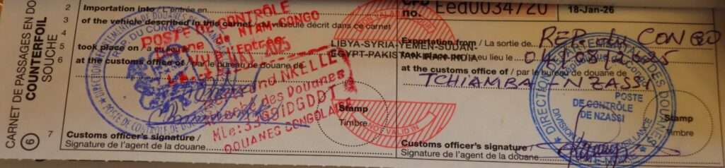 À l’entrée au Congo, la procédure reste fluide : vérification des passeports et visas, tampons sur le CPD, contrôle sommaire du véhicule par la douane, passage au bureau sanitaire (contrôle obligatoire du vaccin contre la fièvre jaune) puis ultime vérification par la police.