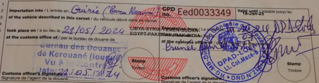 Le CPD apparait une solution plus pratique, le délai de transit du véhicule n’étant pas limité à 30 jours. Aujorud’hui il n’est plus nécessaire de le faire tamponner à Conakry, en théorie. Cela dit nous avons connu des français qui à la sortie se sont vu taxer une centaine d’euros pour ne pas avoir fait valider leur entrée. Cela n’a pas été notre cas