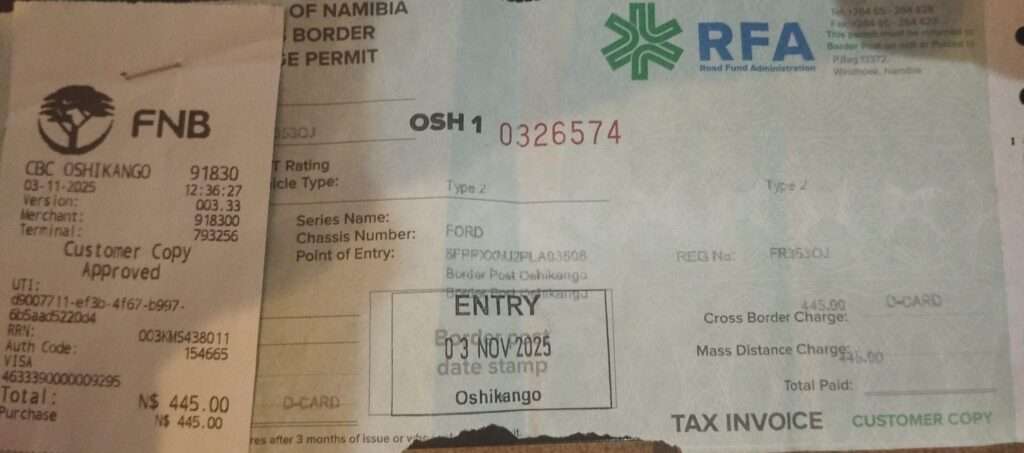 Passer la frontière namibienne avec son propre véhicule est globalement une expérience bien organisée, mais elle obéit à des règles strictes qu’il vaut mieux connaître à l’avance. Dès l’arrivée, une taxe d’entrée pour le véhicule est exigée. Son montant dépend du type de véhicule (voiture, 4×4, camion, camping-car), et elle est à régler directement à la frontière. La procédure est relativement claire et officielle, sans ambiguïté particulière à ce stade.
