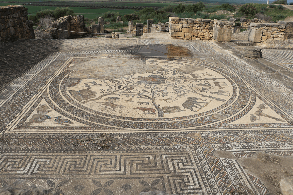 Les fouilles archéologiques menées à Volubilis à partir de 1915 par une équipe d’archéologues français ont permis de faire émerger un patrimoine inestimable, resté enfoui pendant des siècles. Les découvertes majeures réalisées durant ces fouilles ont non seulement révélé les fondations de la ville antique, mais ont aussi mis en lumière l’art et l’ingéniosité des Romains à travers des objets, des sculptures et des éléments architecturaux remarquables. Parmi les trésors retrouvés, les mosaïques, d’une beauté époustouflante et d’une remarquable conservation, occupent une place centrale. Ces mosaïques, véritables œuvres d’art, ont été retrouvées en place dans les ruines des bâtiments où elles ornaient les sols. Elles représentent des scènes mythologiques, des animaux et des motifs géométriques, offrant aux visiteurs un aperçu précis de l’art décoratif de l’époque romaine. Le fait qu’elles soient restées intactes à leur emplacement d’origine permet une immersion authentique dans l’histoire, transportant les visiteurs à l’époque de la splendeur de Volubilis.