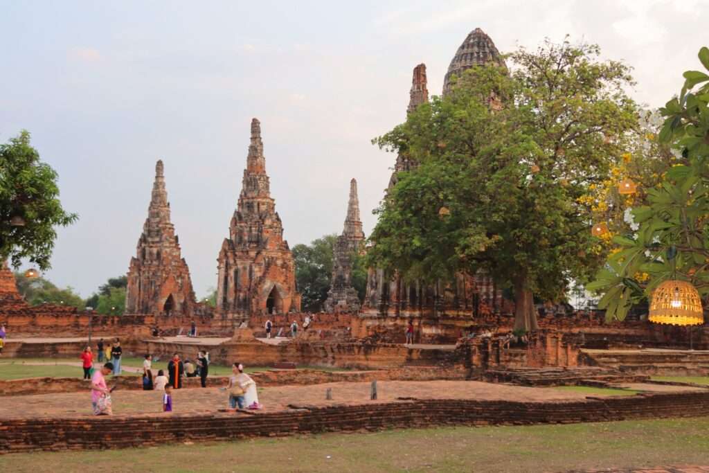 Au crépuscule, Wat Chaiwatthanaram devient un tableau vivant. Les chedis se teintent d’or et de cuivre, les ombres s’allongent, la rivière reflète les silhouettes comme un miroir ancien. Le vent fait frémir les feuilles, les lanternes s’allument peu à peu, et le temple semble flotter entre deux mondes.